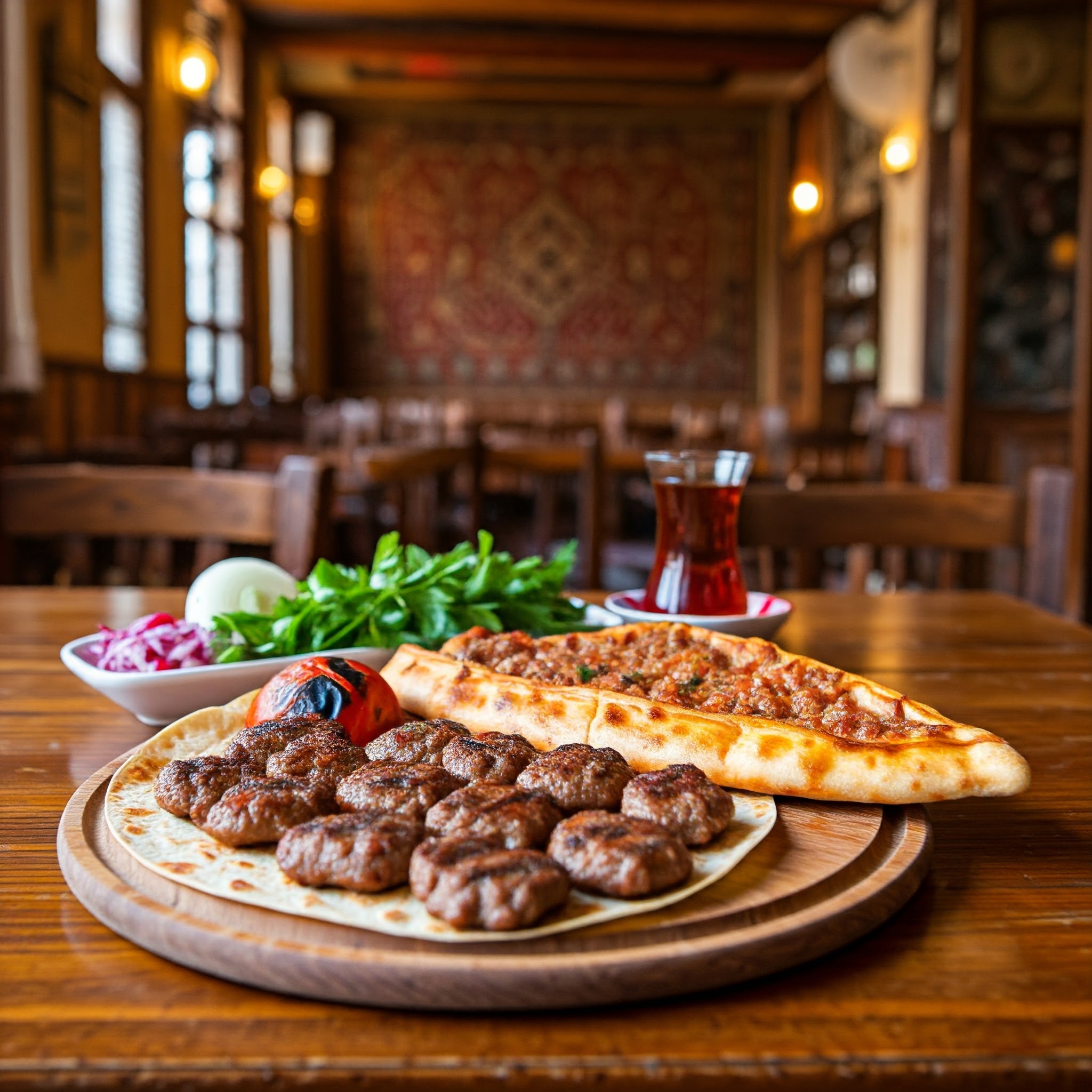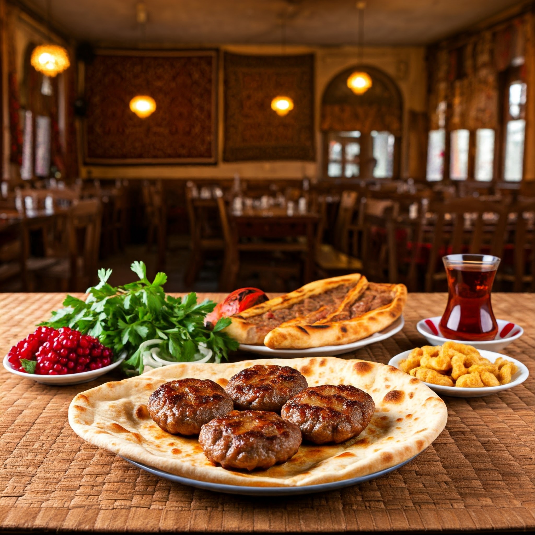 Sivas köftesi ve etli pide, şehre özgü mutfağının vazgeçilmezleri. Yapay zekanın çizdiği sahnede, ızgarada pişen köfteler, etli pideler masanın üzerinde sıcacık bir şekilde duruyor. Yanında soğan, nar ekşisi ve taze baharatlar ise Sivas"ın geleneksel mutfak kültürünü temsil ediyor. Sivas"ın dağlarından gelen temiz hava, o nostaljik sofranın etrafında dönerken, lezzet adeta zamanın içinde bir yolculuğa çıkıyor.