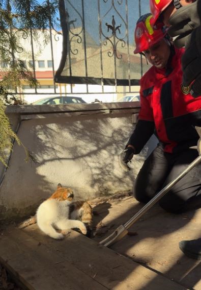 Kedinin yardım çığlığını duyan vatandaşlar, durumu itfaiye ekiplerine bildirdi. Kediyi sıkıştığı yerden kurtaran ekipler, daha sonra doğal yaşam alanına bıraktı.