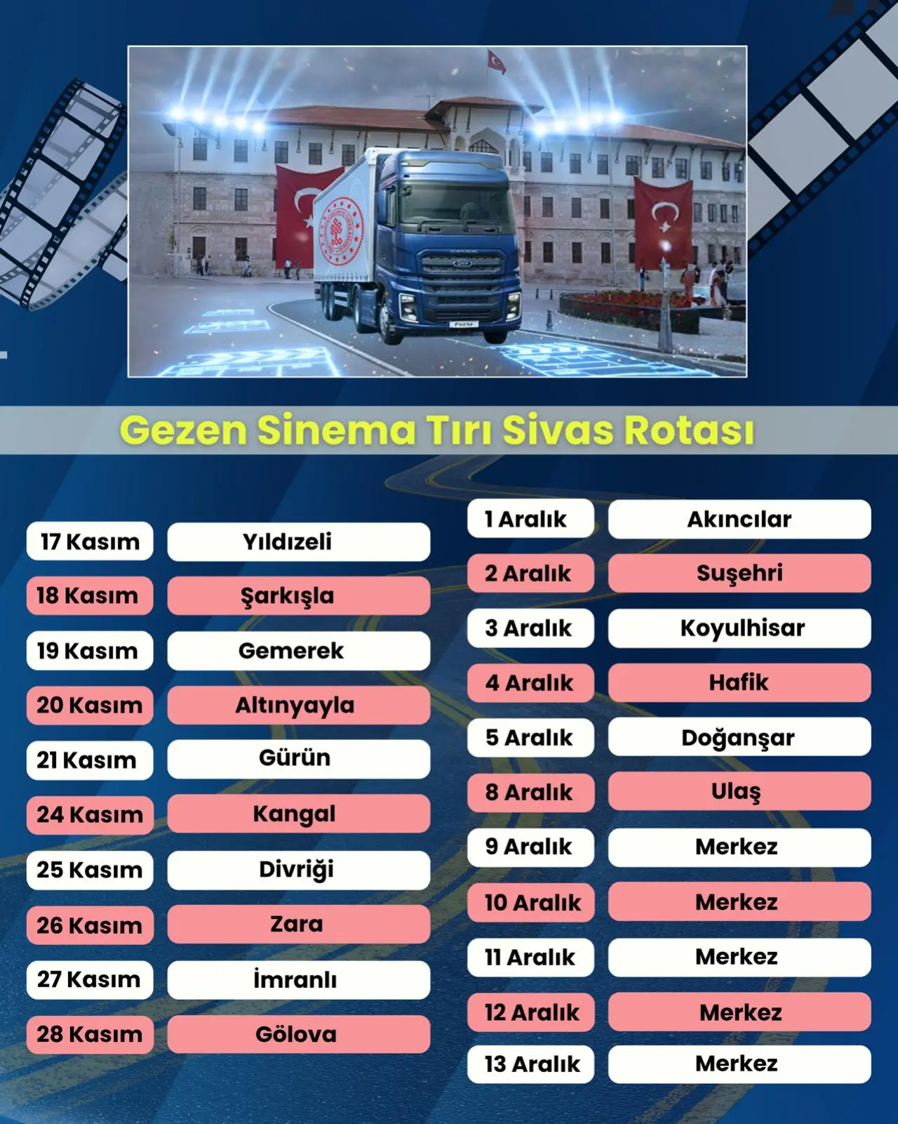 Sivas'taki bu kültür maratonu için takvim de belli oldu. Gezen Sinema Tırı, 17 Kasım 2025 tarihinden başlayarak 13 Aralık 2025 tarihine kadar, toplam 24 gün boyunca Sivas'ta kalacak. Bu süre zarfında, belirlenen program dahilinde Sivas'ın tüm ilçelerine uğrayarak binlerce vatandaşa ulaşacak. Sivas İl Kültür ve Turizm Müdürlüğü'nün hedefi, bu 24 günlük sürede 20 binden fazla Sivaslıya dokunmak ve onlara ücretsiz sinema deneyimi yaşatmak.