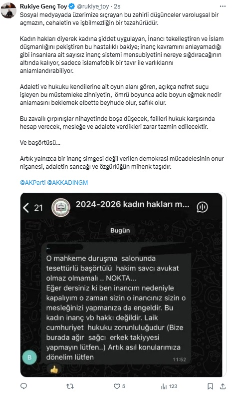 Başörtüsüne ilişkin de değerlendirmede bulunan Toy, “Artık yalnızca bir inanç simgesi değil verilen demokrasi mücadelesinin onur nişanesi, adaletin sancağı ve özgürlüğün mihenk taşıdır” ifadelerini kullandı.