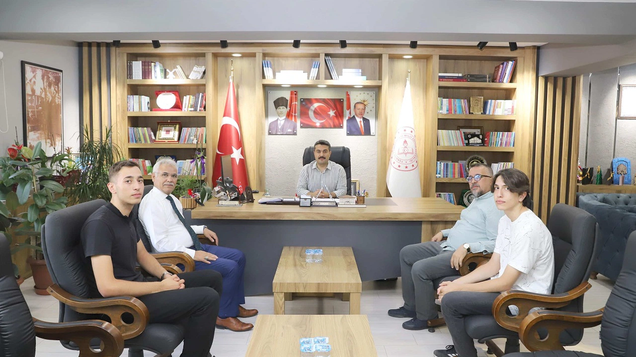 TEKNOFEST 2025 finallerine Sağlıkta Yapay Zekâ kategorisinde NDA Takımı ile katılacak olan Sivas Bilişim Teknolojileri MTAL öğrencileri Ömer Faruk Ayvaz ve Ahmet Efe Kılıç, Millî Eğitim Müdürü Fatih Erdoğan'ı ziyaret etti.