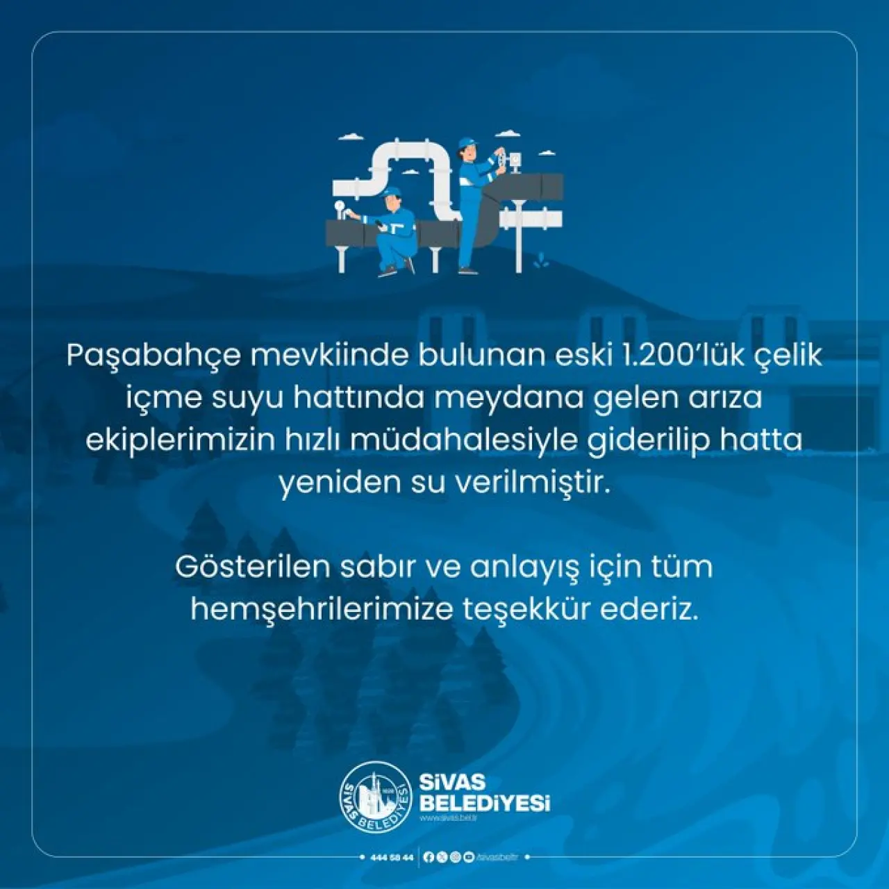 Sivas Belediyesi, Paşabahçe mevkiinde meydana gelen Sivas içme suyu hattı arızası ile ilgili kamuoyunu bilgilendirdi. Belediyenin resmi sosyal medya hesapları üzerinden yapılan açıklamada, bölgede bulunan eski 1.200’lük çelik içme suyu hattında meydana gelen arızanın ekiplerin hızlı müdahalesiyle giderildiği belirtildi. Onarım çalışmalarının tamamlanmasının ardından hatta yeniden su verildiği ifade edildi.