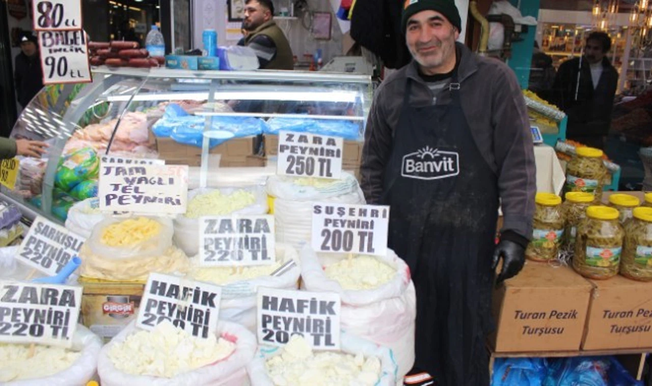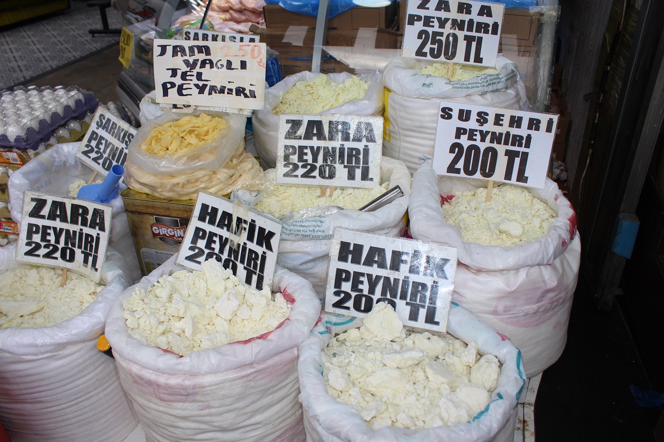 Zara peyniri 250 TL, Suşehri peyniri 200 TL, Hafik peyniri 200 TL, Şarkışla peynir 180 TL, Erzurum tel peynir 250 TL, Sivas çökelik 120 TL.