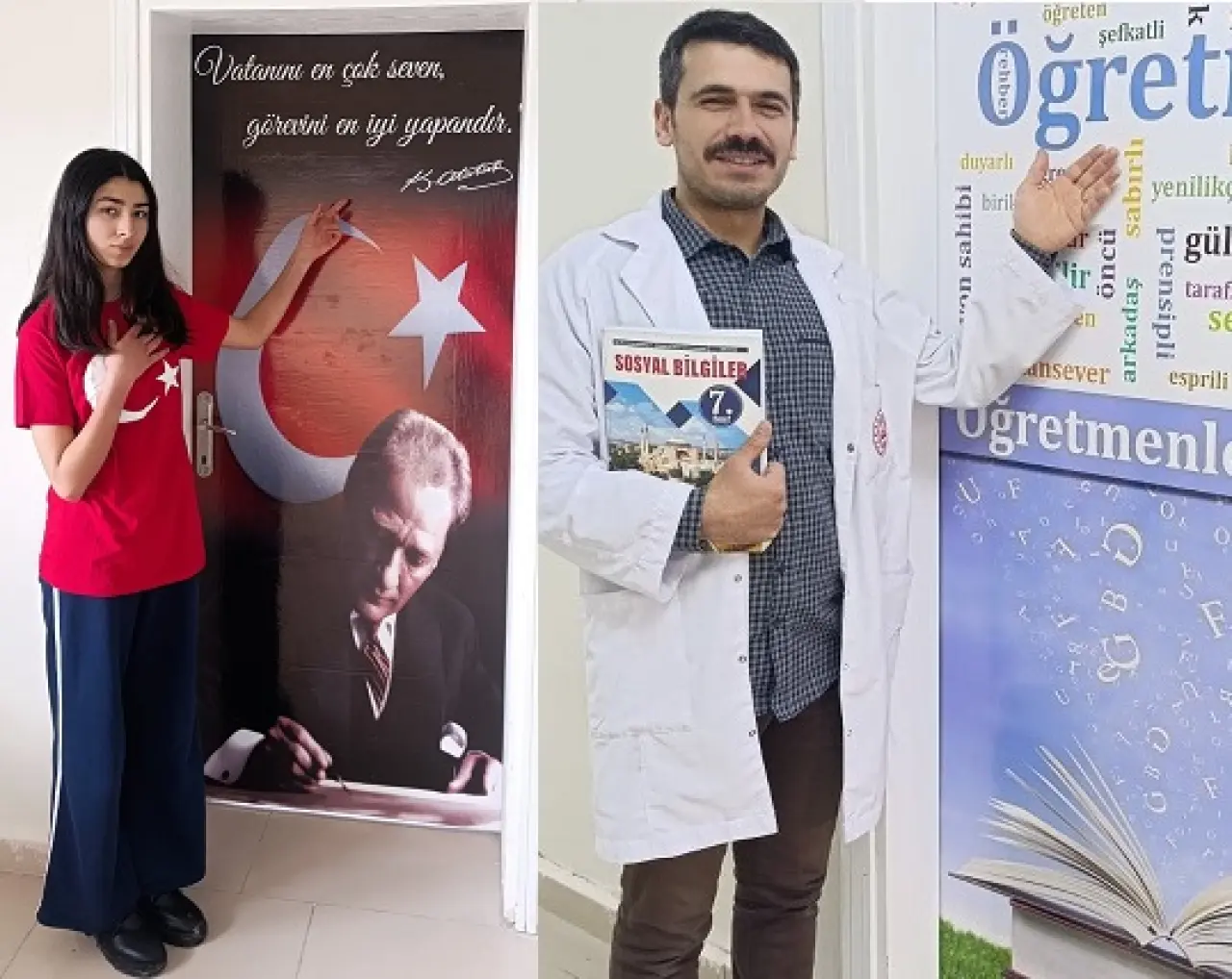 Sivas’ın Ulaş ilçesine bağlı Baharözü Köyü Ortaokulu’nda hayata geçirilen çalışma, hem öğrencilerin hem de velilerin dikkatini çekti. Okulun sınıf kapıları, Türkiye Cumhuriyeti’nin kurucusu Mustafa Kemal Atatürk ile halk ozanı Aşık Veysel’in resimleri ve anlamlı sözleriyle kaplandı.