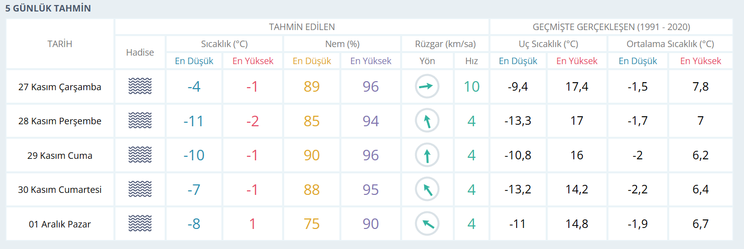 - Gün içinde: Sis etkisini sürdürürken sıcaklık -2°C"ye kadar yükselecek. Hissedilen sıcaklık -1,7°C. Nem oranı %94.