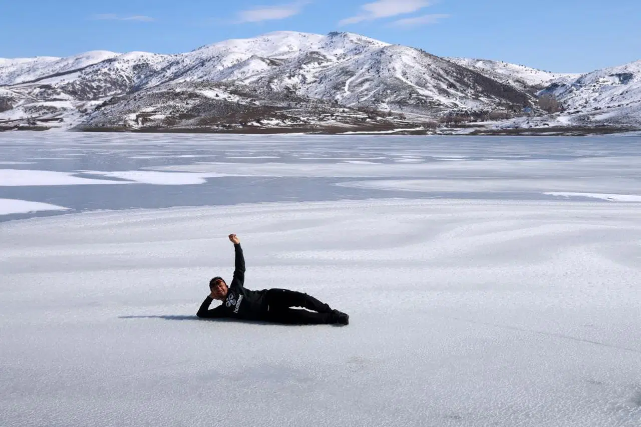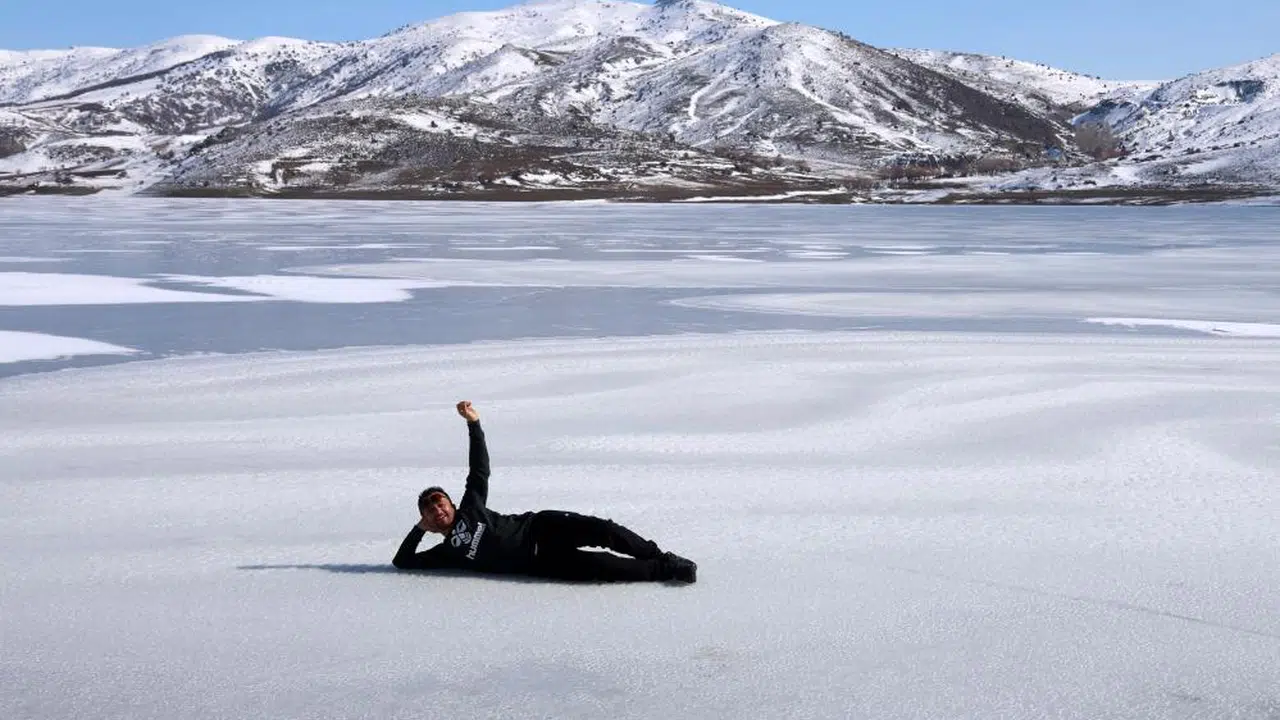 Dondurucu soğukların yaşandığı Sivas’ta Yıldız baraj gölünün yüzeyi tamamen buz tuttu, meraklıları üzerinde yürüyerek fotoğraf çektirdi.