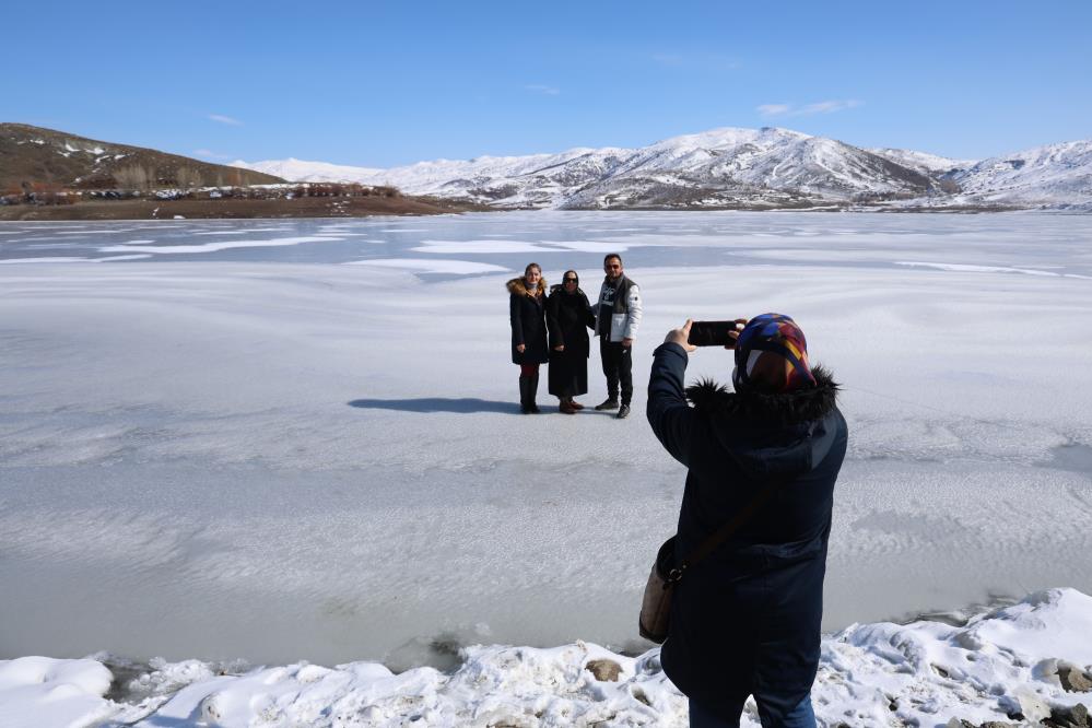 Çeşitli illerden kış tatili için Sivas’a geldiklerini belirtenler buz tutan gölün yüzeyinde yürüme fırsatı bularak tarifsiz bir deneyim yaşadıklarını dile getirdiler.