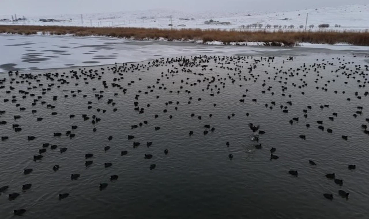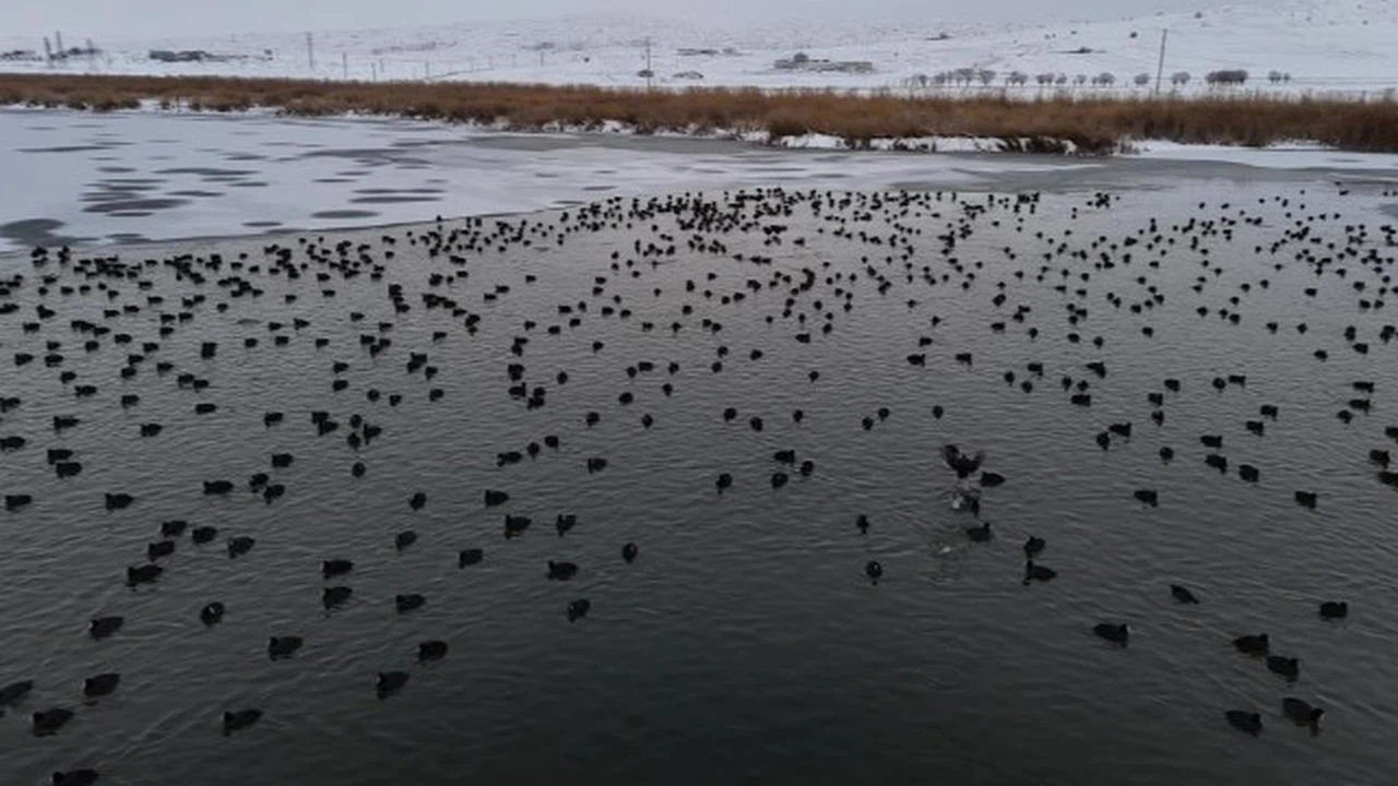 Sivas'ın Hafik ilçesinde bulunan Hafik Gölü'nün yüzeyi buz tuttu. Gölde buz tutmayan bazı kısımlarında toplanan yüzlerce sakarmeke kuşu ise adeta görsel şölen oluşturdu.