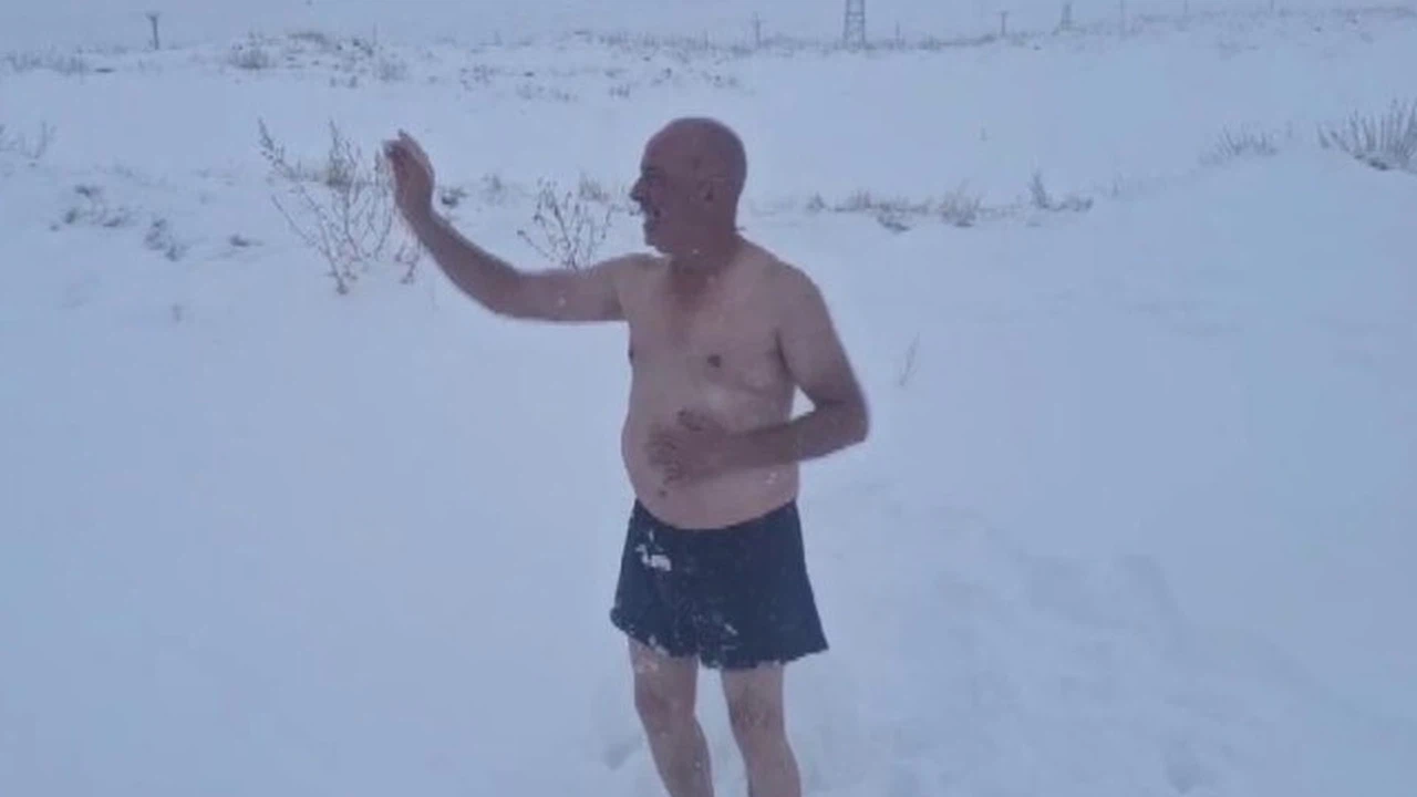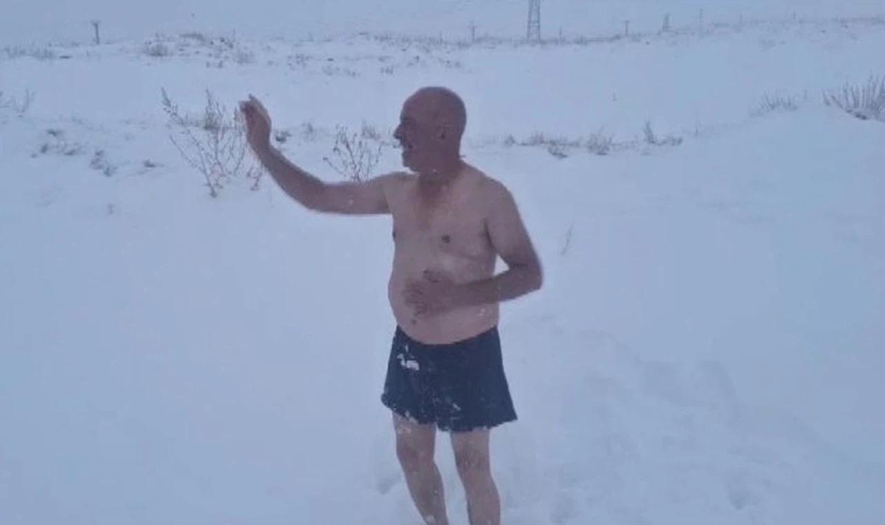 Şarkışla ilçesinde yaşayan 60 yaşındaki adam, dondurucu soğuğa rağmen soyunarak kar banyosu yaptı. O anlar cep telefonu kamerasına yansıdı.