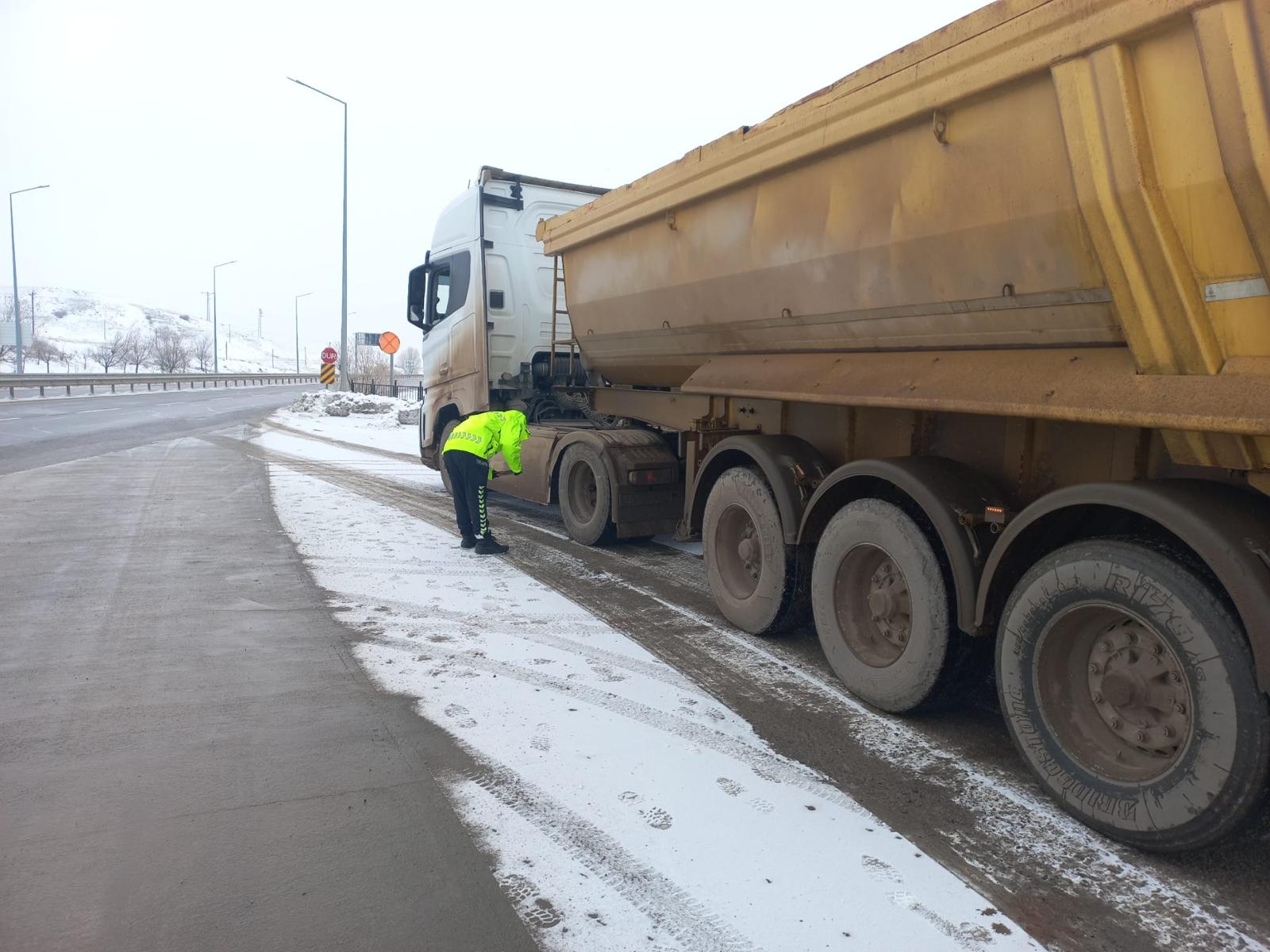 Karlı ve buzlu yollarda güvenli bir trafik ortamının sağlanması amacıyla Sivas İl Emniyet Müdürlüğü Bölge Trafik Denetleme Şube Müdürlüğü ve Sivas İl Jandarma Komutanlığı Trafik Jandarması ekiplerince “Kış Lastiği Denetimleri” devam ediyor.