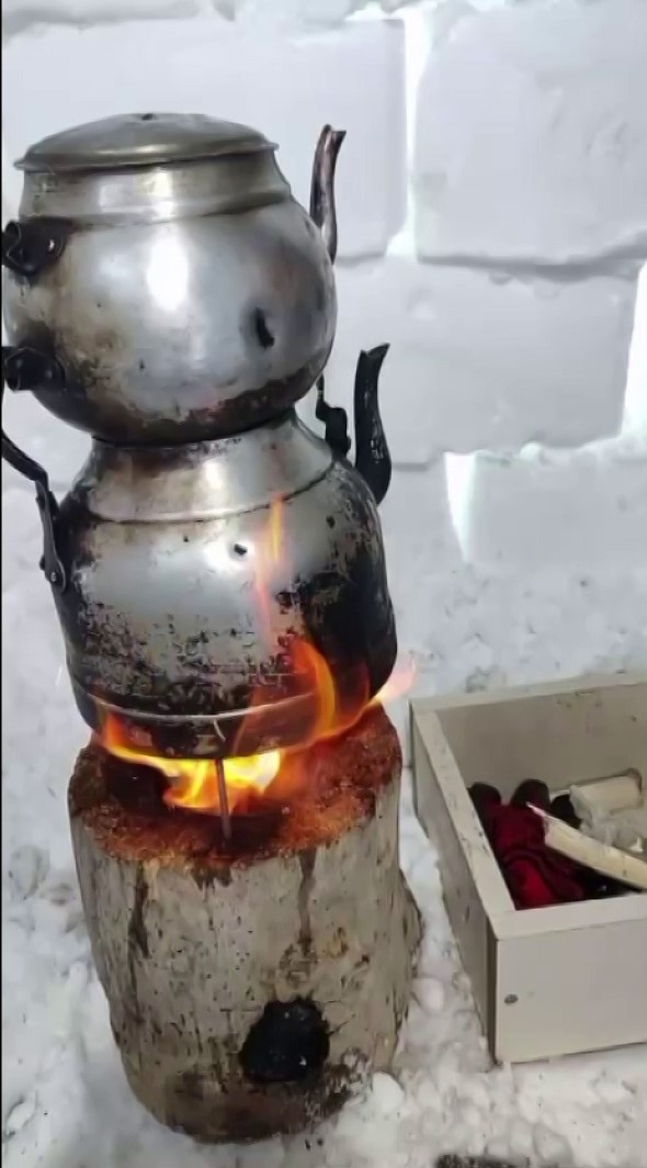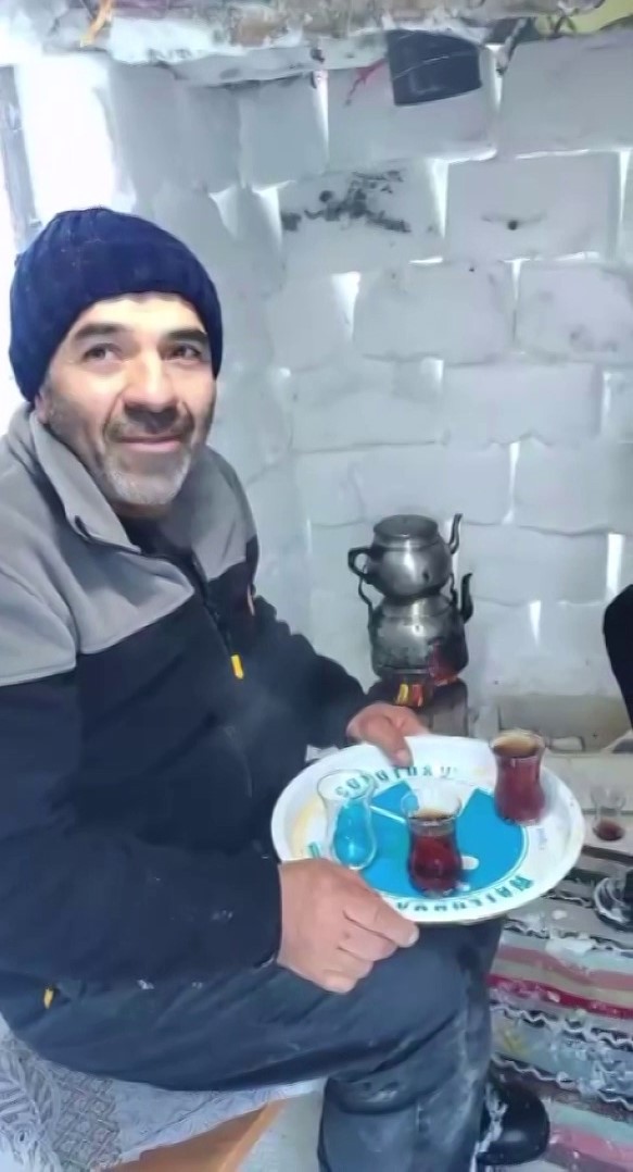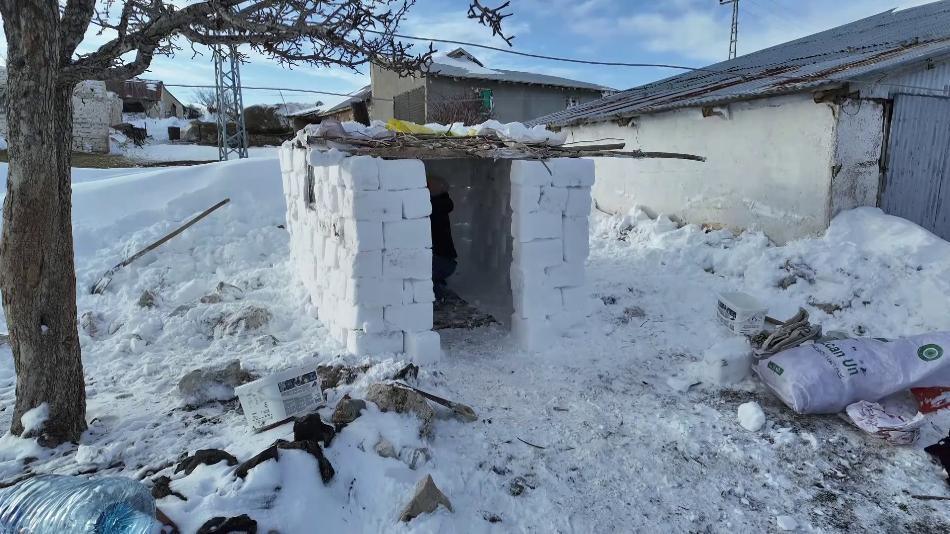 Kışa yakalandık. Birkaç gündür köyde mahsur kaldık. Biz de boş vaktimizi değerlendirmek istedik. Böyle güzel bir kardan ev yaptık. İçerisinde sobası bacası her şeyi içinde” dedi.
