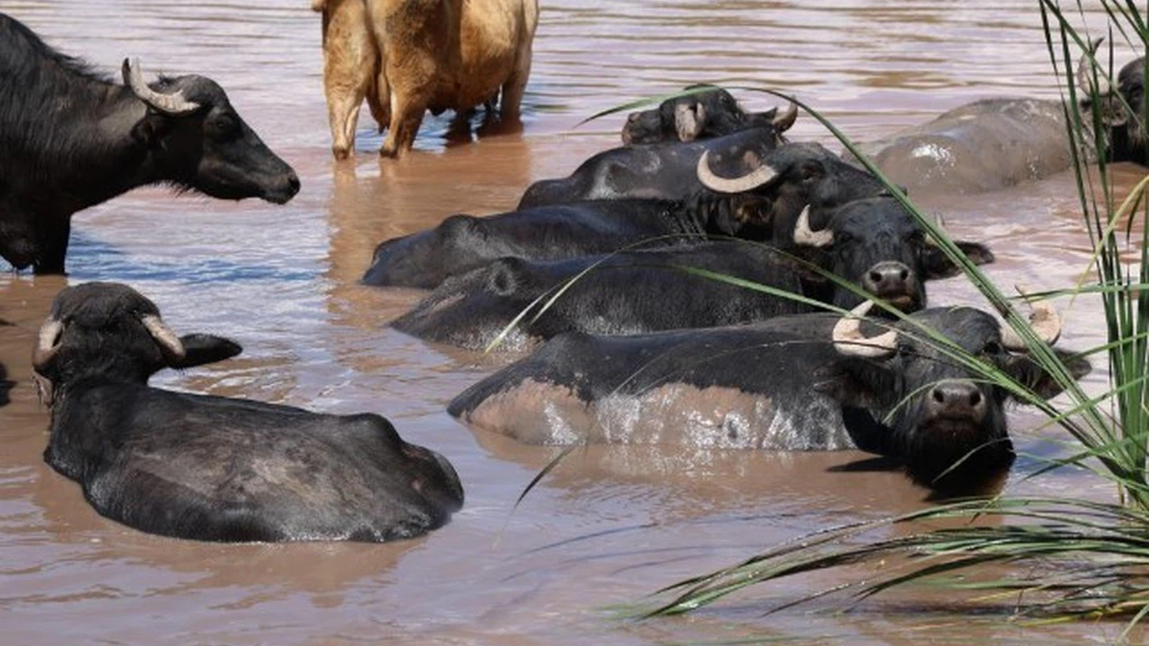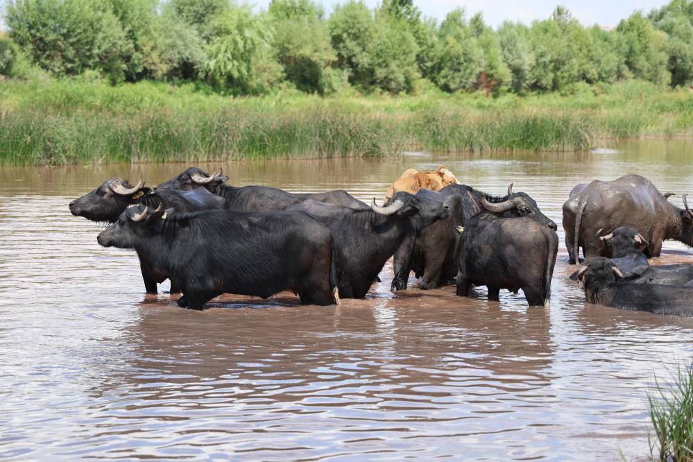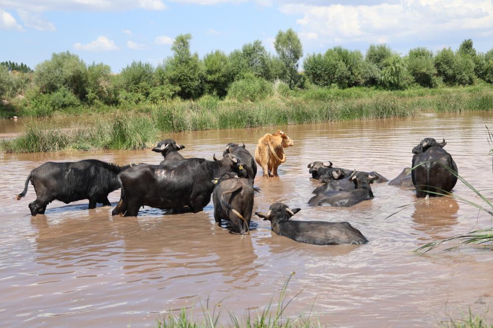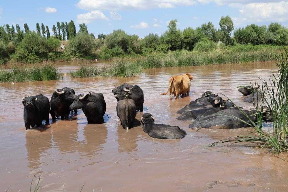 Hava sıcaklığının öğle saatlerde 30 dereceyi bulduğu Sivas"ta sıcak hava insanlar kadar hayvanları da etkiliyor. Kızılırmak kenarında otlayan mandalar sıcaktan etkilenince çareyi nehre girmekte buldu.