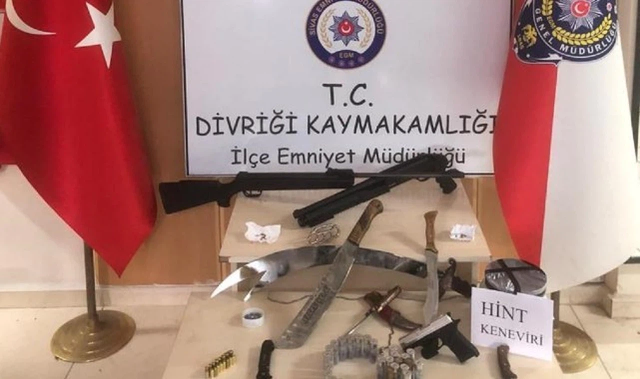 Sivas"ta Divriği İlçe Emniyet Müdürlüğü ekipleri, ilçede bir adrese operasyon düzenledi. Suç ve suç unsurlarının tespiti ve yakalanmasına yönelik yapılan çalışmada; 2 adet pala, 1 adet kılıç, 1 adet hançer, 2 adet bıçak, 1 adet muşta, 1 adet kurusıkı tabanca ve tabancaya ait 16 adet kurusıkı fişek, 1 adet av tüfeği ve tüfeğe ait 29 adet fişek, 1 adet havalı tüfek ve tüfeğe ait 56 adet fişek, 5 adet 9x19 mm tabanca fişeği, 75 adet kenevir tohumu, 1 adet saksı içerisinde ekili kenevir ele geçirildi. Bahse konu olaya ilişkin 1 şahıs yakalanarak gözaltına alındı.