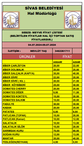 Sivas Belediyesi Hal Müdürlüğü Sebze Meyve fiyatları her hafta belirlenen rakamlarla resmi siteden duyuruluyor. Belirlenen fiyatların kat kat üstünde satışlar ise serbest piyasa adı altında belirsizliğini sürdürüyor.
