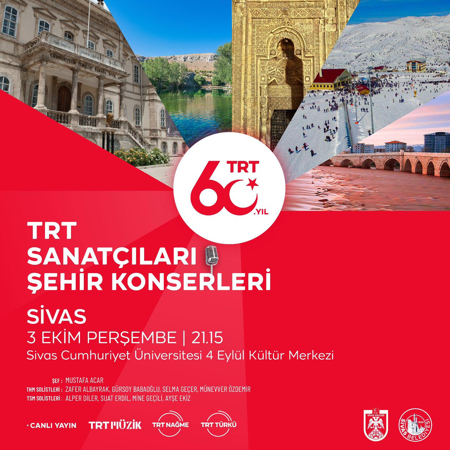 Konu hakkında edinilen bilgilere göre, TRT sanatçıları şehir buluşması konseri Sivas'ta perşembe günü saat 21.15'te Sivas Cumhuriyet Üniversitesi Dört Eylül Kültür Merkezi'nde gerçekleştirilecek. TRT Müzik kanalı tarafından konser canlı yayınlanacak.