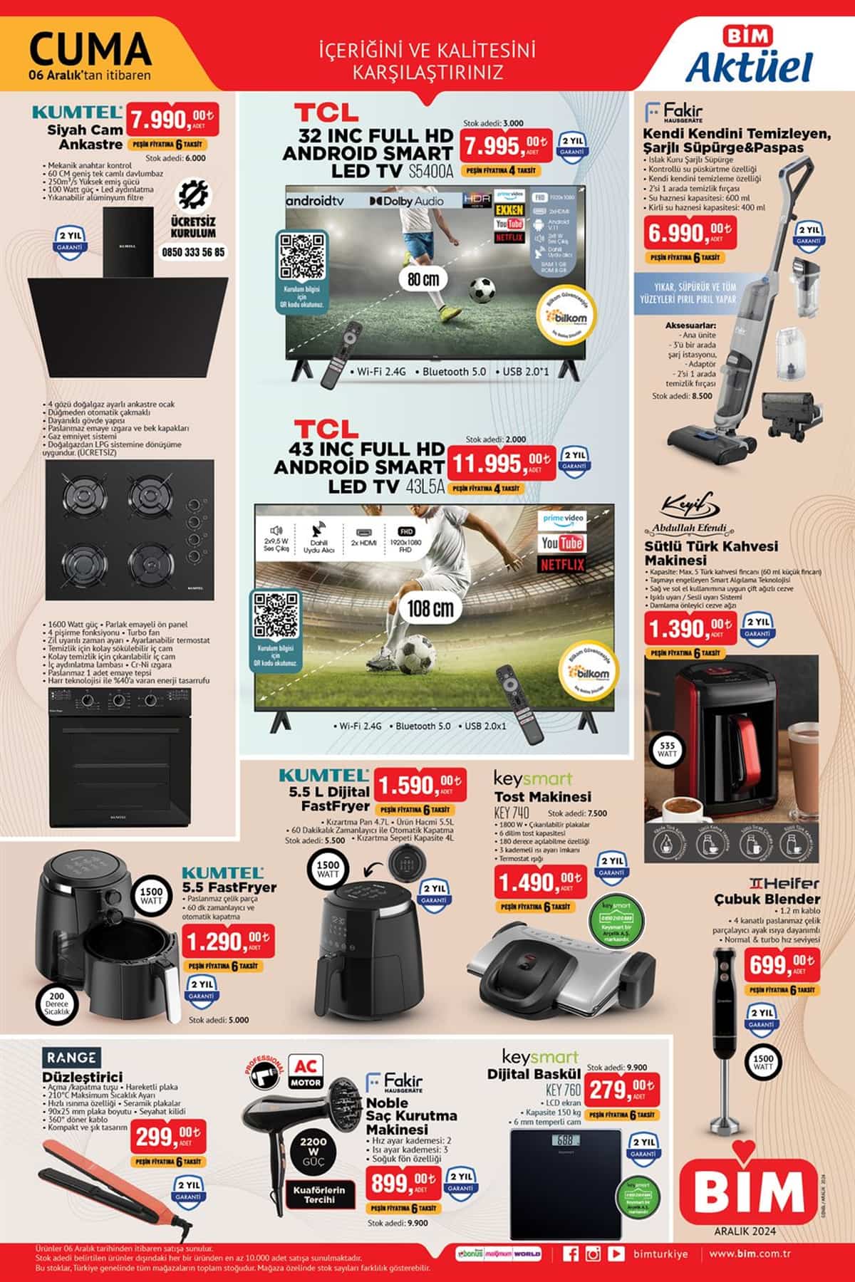 Özellikle teknoloji ürünleri kategorisinde öne çıkan fırsatlarda, TCL 32” Full HD Android Smart LED TV 7.995 TL ve TCL 43” Full HD Android Smart LED TV 11.995 TL fiyatlarıyla dikkat çekiyor. Ayrıca, Kumtel Siyah Cam Ankastre Set, dokunmatik kontrol paneli ve modern tasarımıyla 7.990 TL"den satışta.