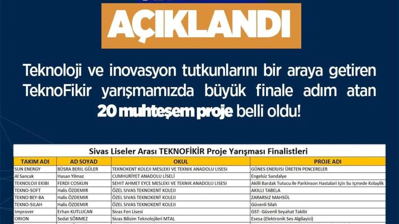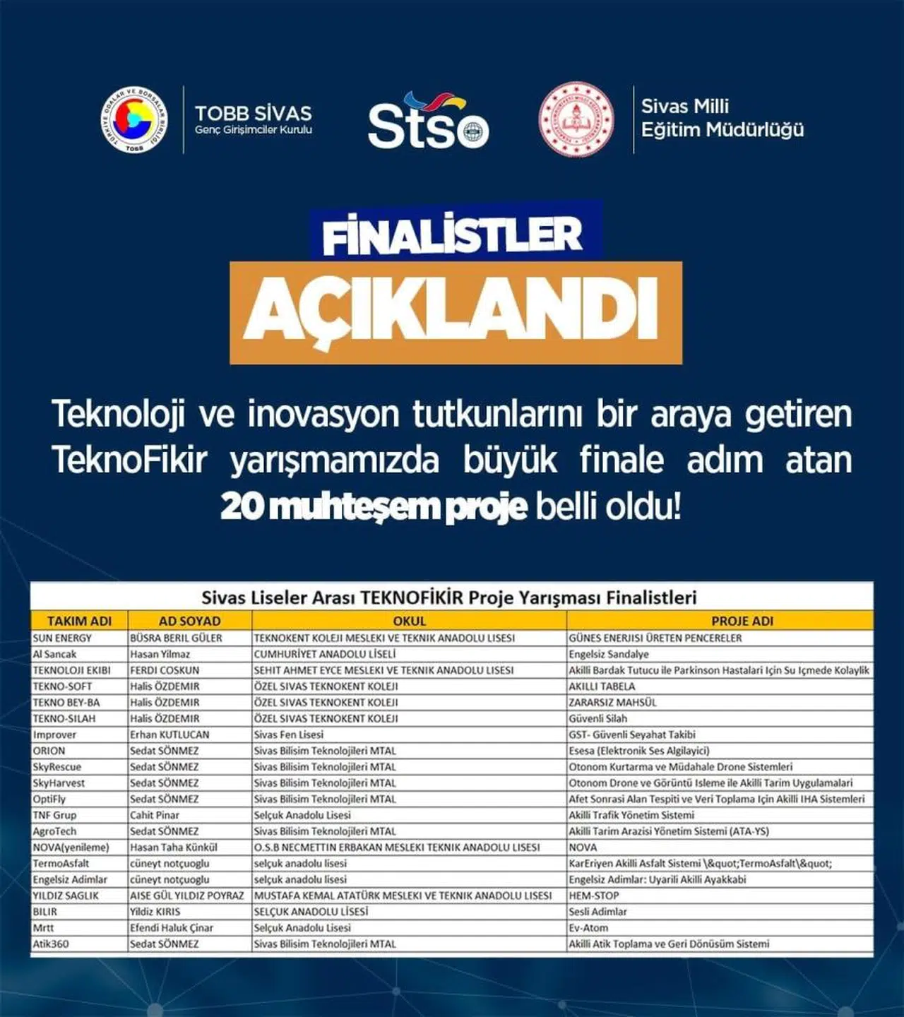 Sivas TEKNOFİKİR Proje Yarışmasında başvuru süreci tamamlanırken, büyük finale kalan projeler açıklandı. Özel Sivas Teknokent Koleji, 4 farklı proje ile finale kalma başarısı gösterdi.