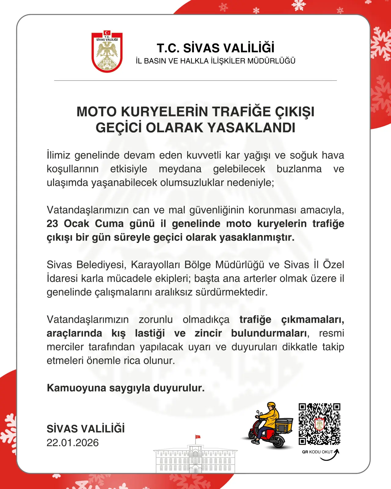 Olumsuz hava koşullarının en çok etkilediği gruplardan biri olan moto kuryeler için de flaş bir yasak getirildi. Buzlanma ve şiddetli rüzgar nedeniyle can ve mal güvenliğini korumak adına, 23 Ocak Cuma günü il genelinde moto kuryelerin trafiğe çıkışı tamamen yasaklandı. Valilik, bu kısıtlamayla oluşabilecek trafik kazalarının ve olumsuz durumların önüne geçmeyi amaçlıyor.