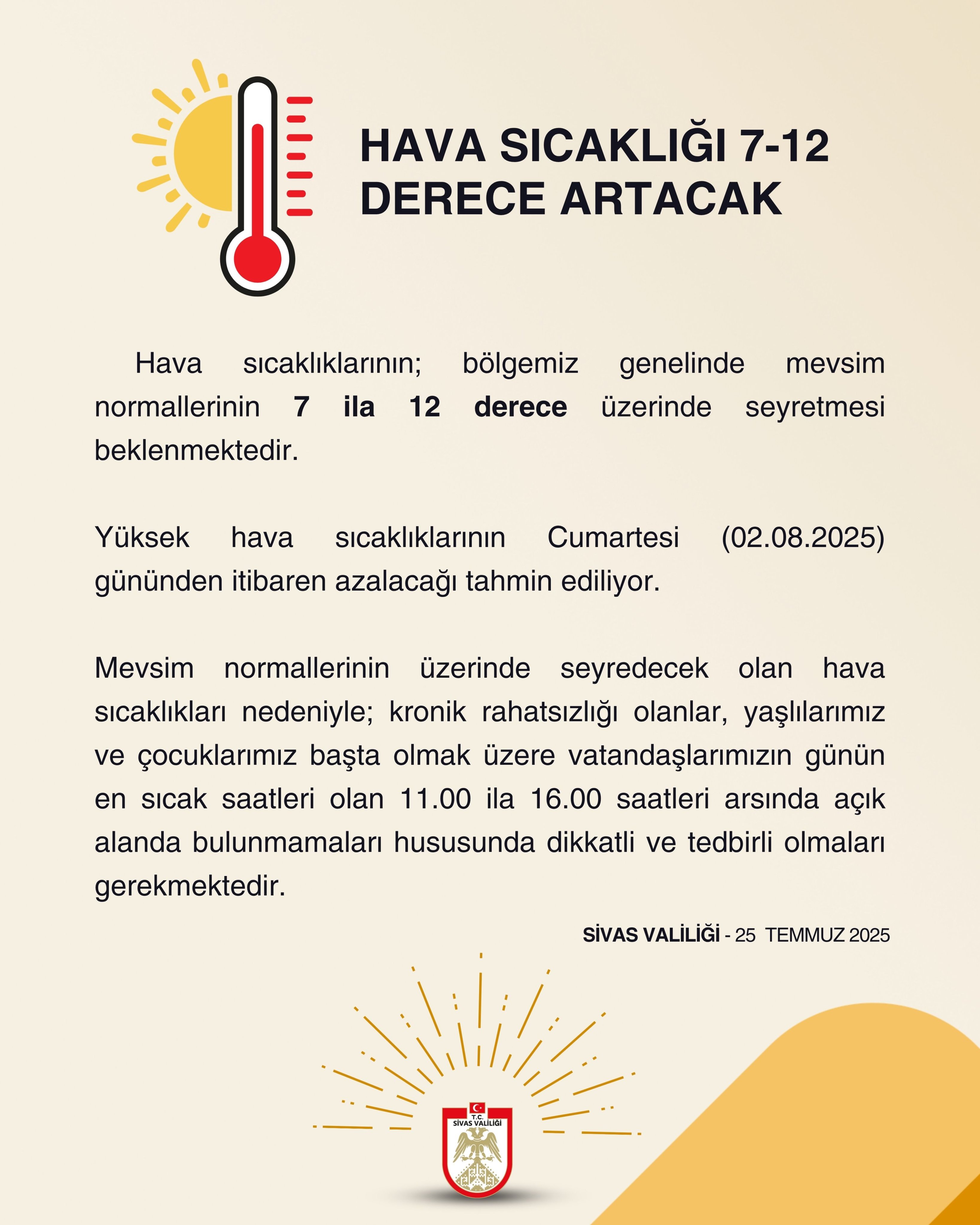 Sivas Valiliği açıklamasında, kronik rahatsızlığı bulunan kişiler, yaşlılar ve çocuklar başta olmak üzere herkesin günün en sıcak saatleri olan 11.00 ile 16.00 arasında açık alanlarda bulunmamaları gerektiği belirtildi. Vatandaşların gerekli önlemleri alması ve tedbirli davranması istendi.