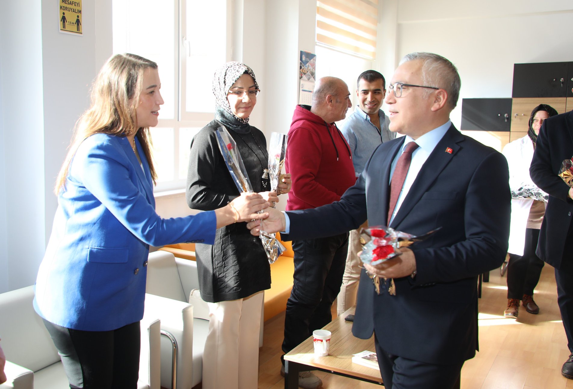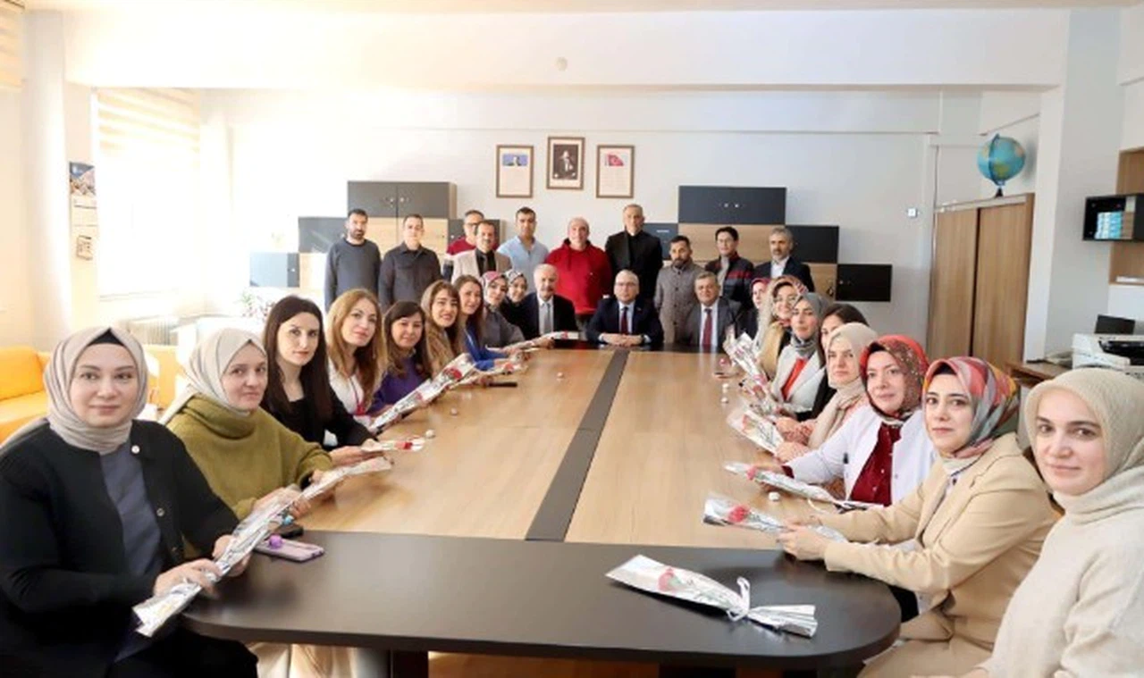 Valimiz Yılmaz Şimşek, sınıf ziyaretlerinin ardından okulda görev yapan öğretmenlerle bir araya geldi. Şimşek, öğretmenlere çiçek takdim ederek yaklaşan 24 Kasım Öğretmenler Günü dolayısıyla tebriklerini iletti. Öğretmenlerle sohbet ederek okulda yürütülen proje ve çalışmalar hakkında bilgi alan Valimiz Şimşek, görüş, öneri ve talepleri dinledi.