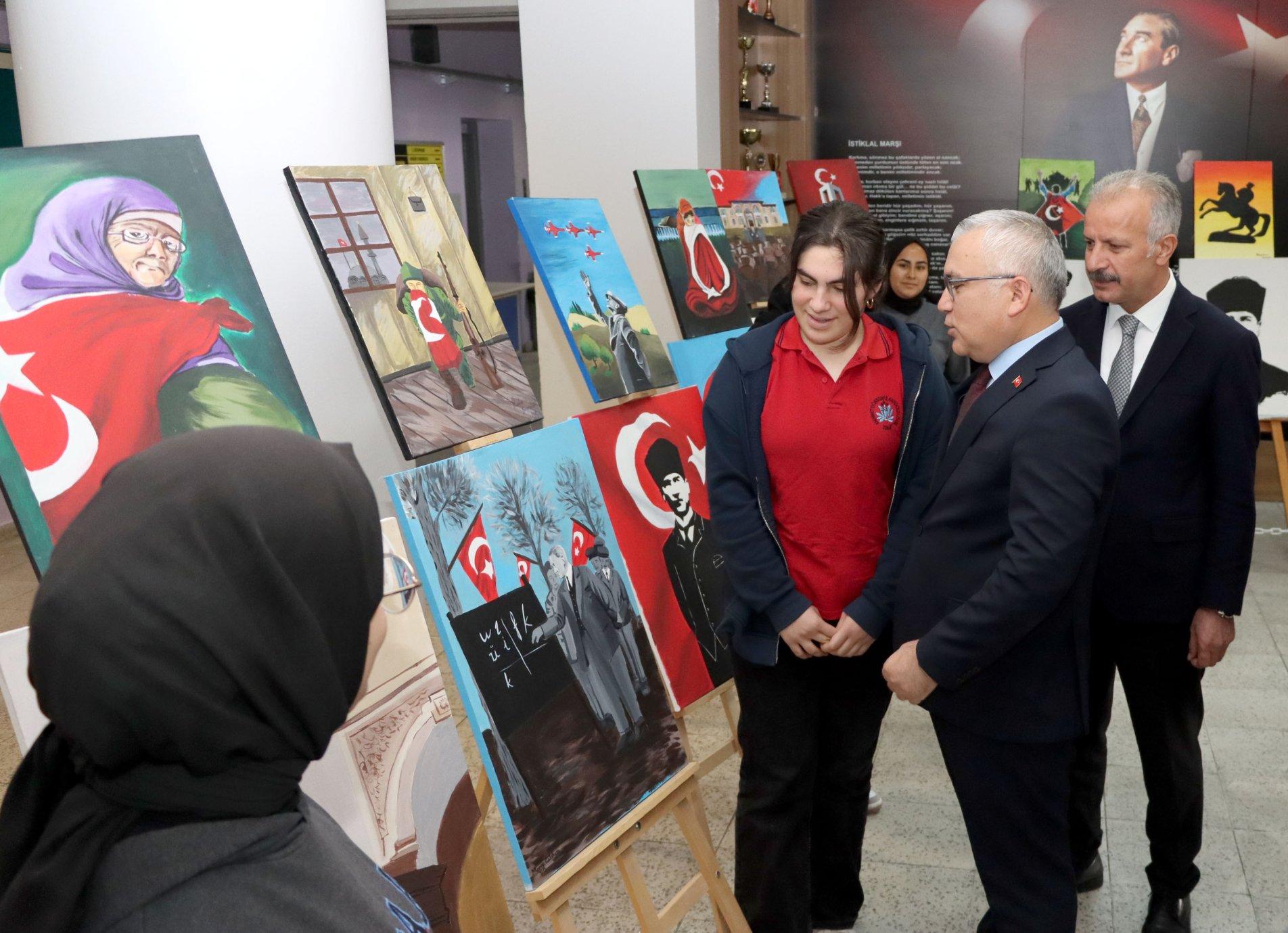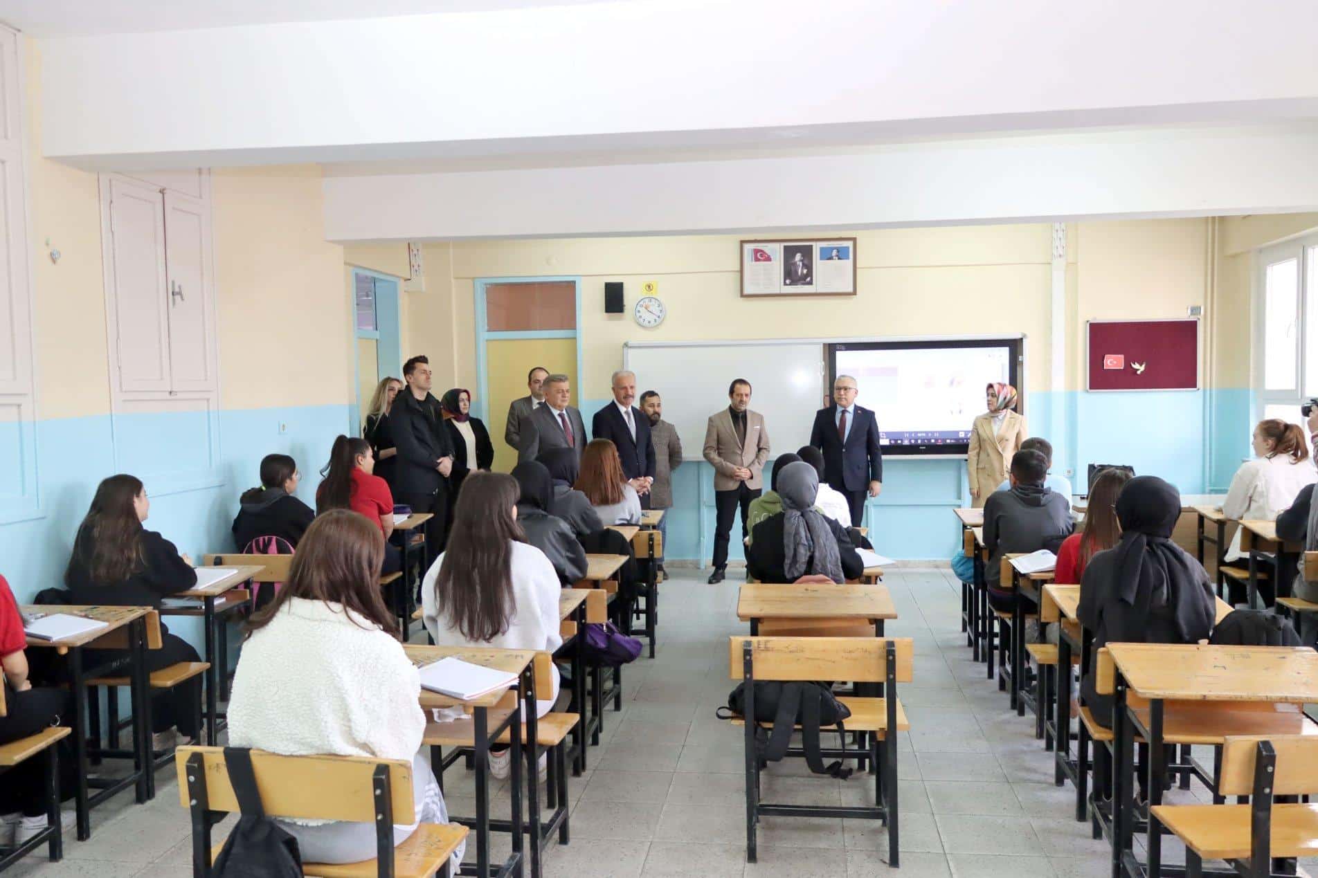 Valimiz Şimşek, ilk olarak öğrenciler tarafından "Atatürk ve Cumhuriyet" temasıyla çizilen ve okul koridorunda sergilenen resim çalışmalarını inceledi. Öğrencilerden eserleri hakkında bilgi alan Valimiz Şimşek, tebriklerini iletti. Daha sonra sınıf ziyaretlerinde bulunan Valimiz Şimşek, bir süre öğrencilerle sohbet ederek başarı dileklerini iletti.