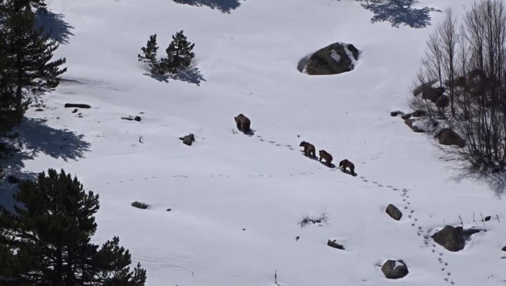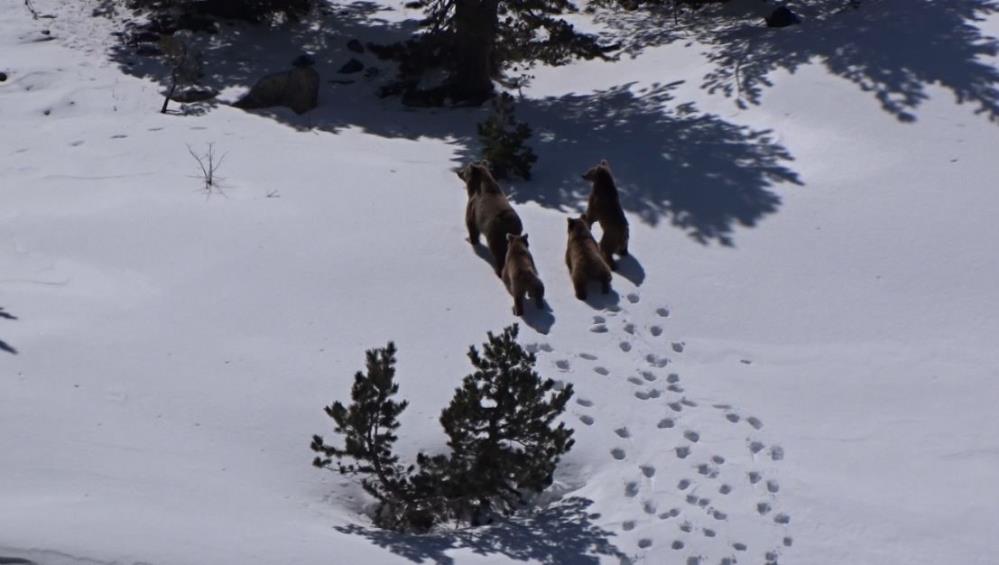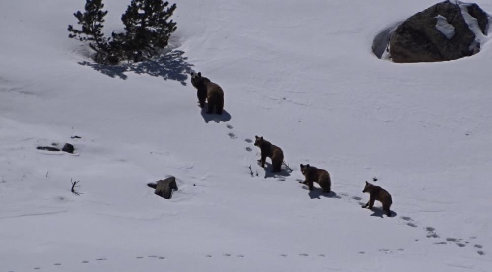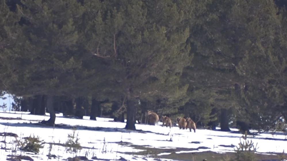 Uzun kış uykusunun ardından karınları acıkan anne ve yavruları, bir süre yiyecek aradıktan sonra doğal ortamlarında gözden kayboldu. Bu sevimli görüntü,