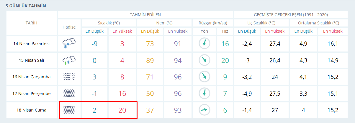 - 17 Nisan Perşembe: En düşük -1°C, En yüksek 16°C (Sisli) - Gündüz sıcaklığında belirgin bir artış!