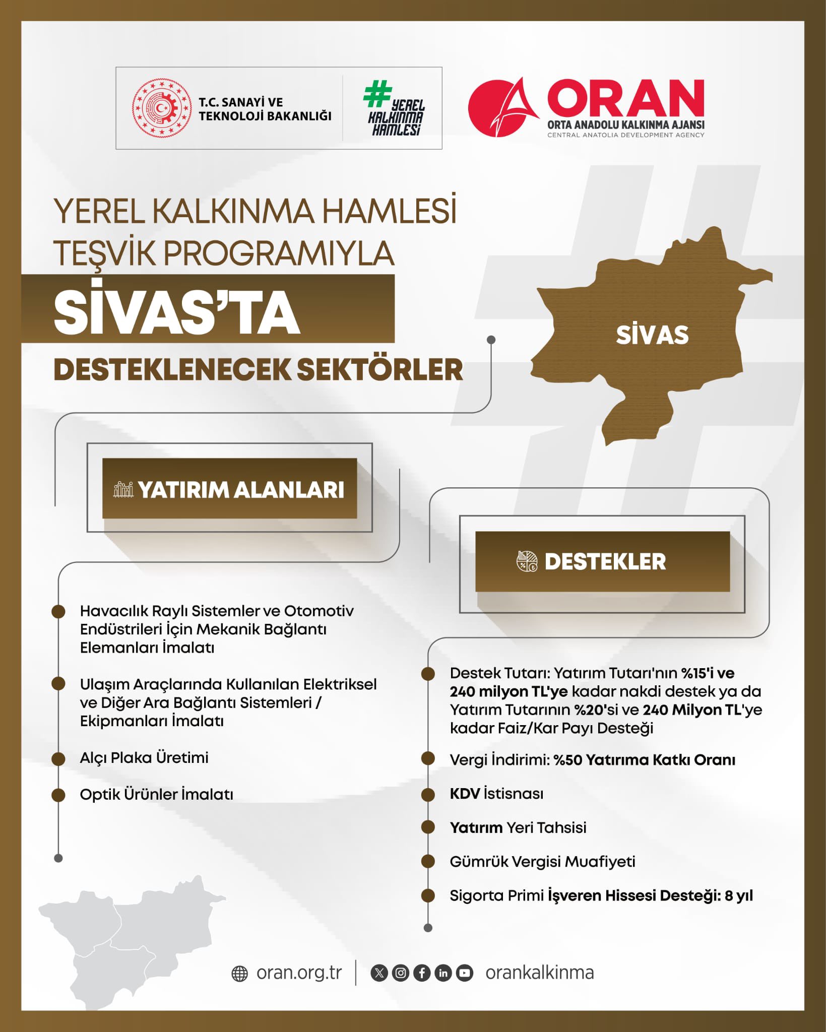 Sivas'ı Anadolu'nun parlayan sanayi yıldızı yapma hedefiyle, Sanayi ve Teknoloji Bakanlığı ile Orta Anadolu Kalkınma Ajansı (ORAN) tarafından eşi benzeri görülmemiş bir teşvik programı başlatıldı. "Yerel Kalkınma Hamlesi Teşvik Programı" adıyla duyurulan bu dev adım, Sivas'ı yüksek teknolojili ve katma değerli üretimin merkezi haline getirmeyi amaçlıyor.
