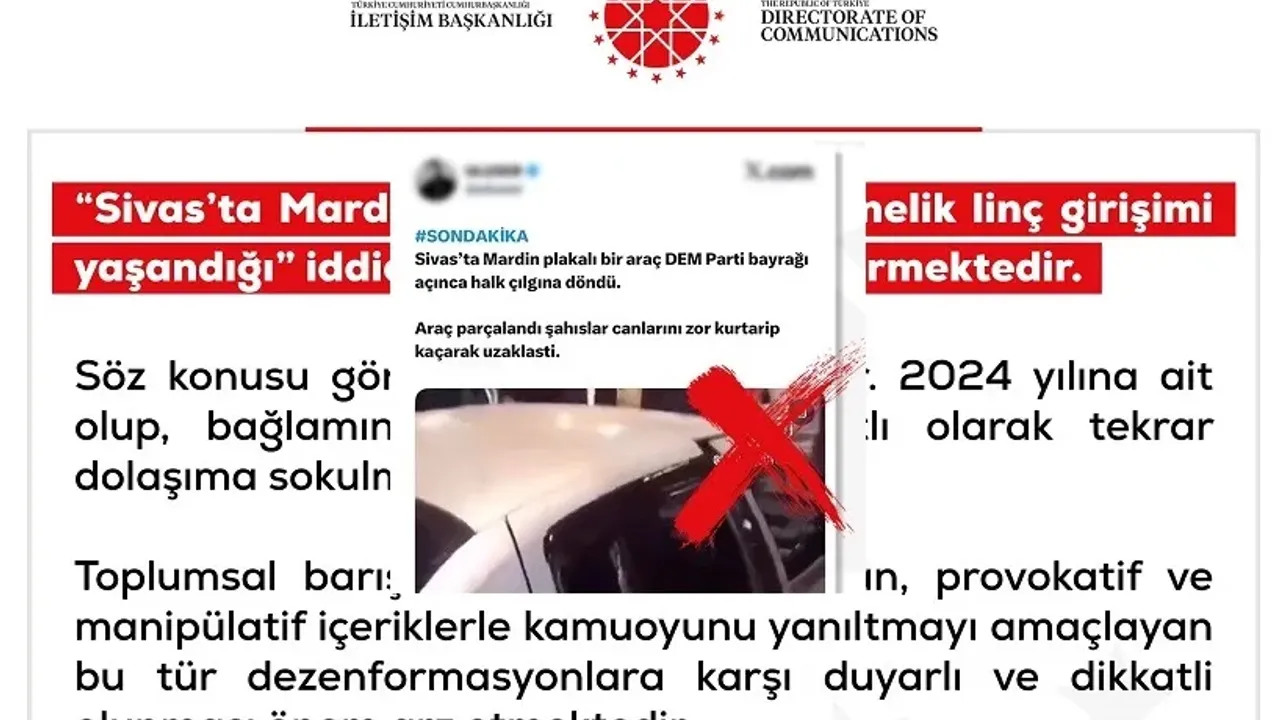 Sosyal medya platformlarında paylaşılan ve “Sivas’ta Mardin plakalı bir araca linç girişimi yaşandı” iddiasıyla servis edilen görüntüler kısa sürede geniş kitlelere ulaştı. Paylaşımların ardından kamuoyunda oluşan tepkiler ve artan tartışmalar üzerine, T.C. İletişim Başkanlığı Dezenformasyonla Mücadele Merkezi konuyla ilgili açıklama yaptı. Merkez, söz konusu iddiaların gerçeği yansıtmadığını ve paylaşılan içeriklerin dezenformasyon niteliği taşıdığını duyurdu.
