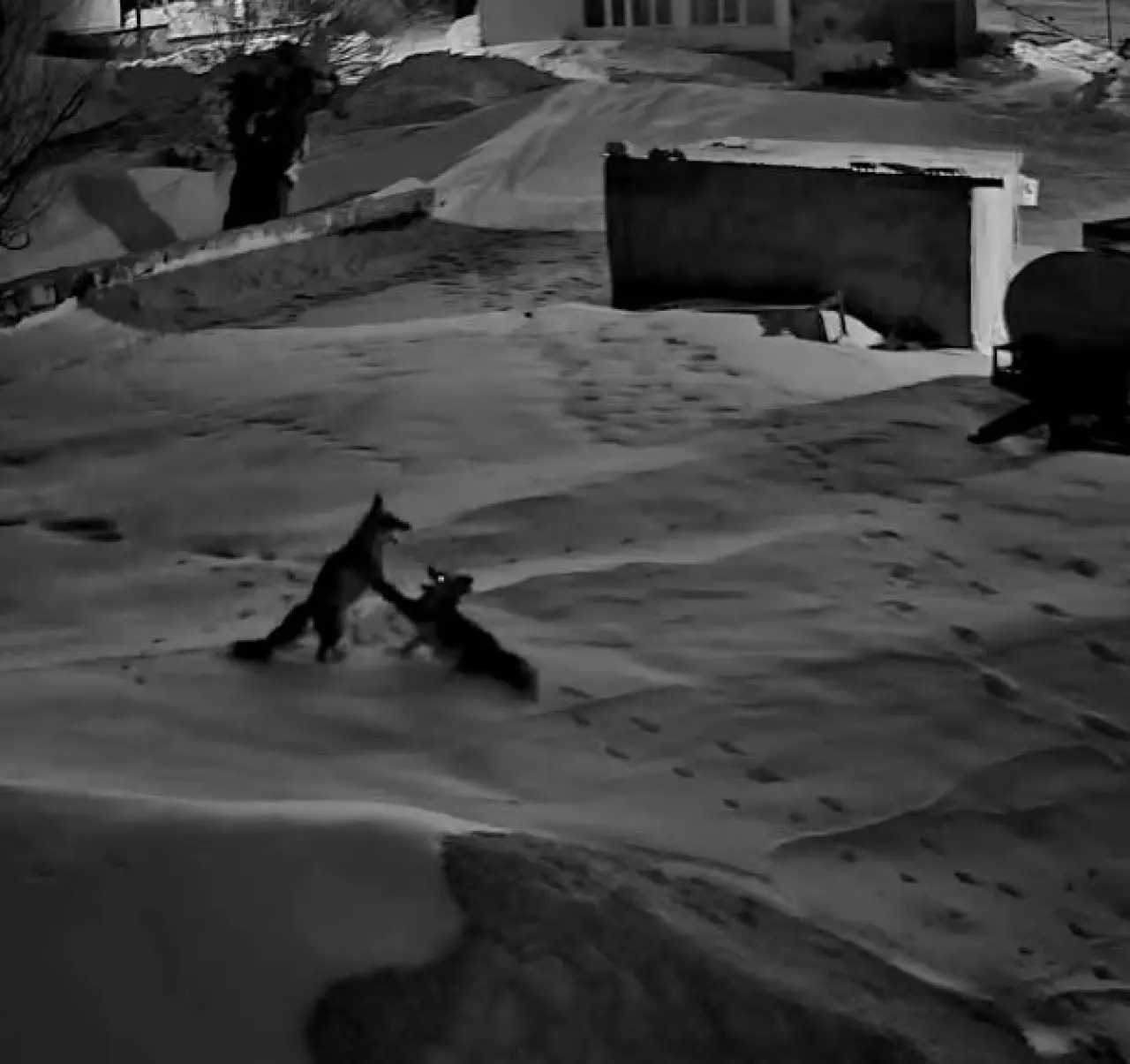 Güvenlik kamerasına saniye saniye yansıyan görüntülerde, iki tilkinin kar üzerinde bir süre mücadele ettiği görülüyor. Birkaç dakika süren kavganın ardından tilkiler bölgeden uzaklaşarak gözden kayboldu.