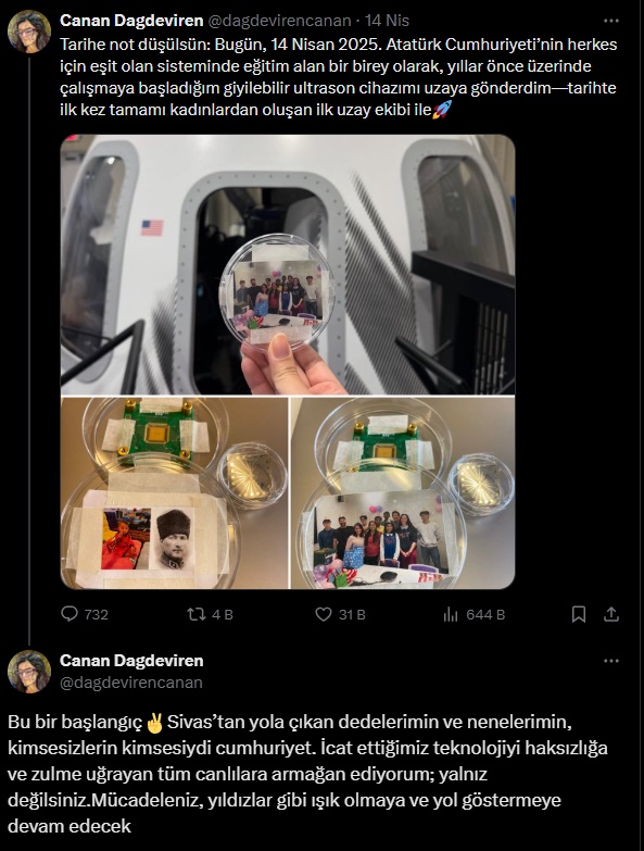 "Tarihe not düşülsün: Bugün, 14 Nisan 2025. Atatürk Cumhuriyeti’nin herkes için eşit olan sisteminde eğitim alan bir birey olarak, yıllar önce üzerinde çalışmaya başladığım giyilebilir ultrason cihazımı uzaya gönderdim—tarihte ilk kez tamamı kadınlardan oluşan ilk uzay ekibi ile Bu bir başlangıç."