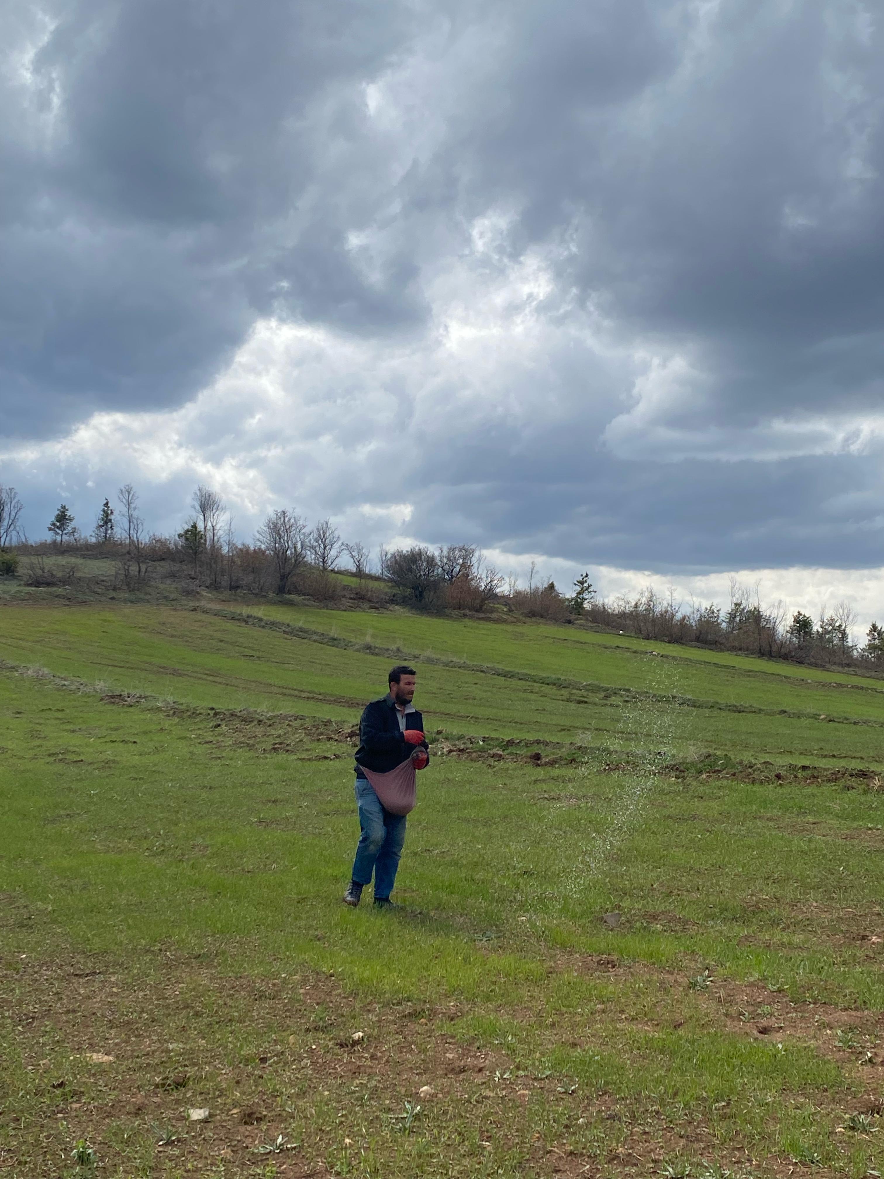 Köyün tanınmış çiftçilerinden Selami Bulut ve kardeşi Ali Bulut, küçük arazilerde geleneksel yöntemleri tercih ederek gübreyi elleriyle attı. Traktör yerine, kollarına taktıkları gübre önlüğünü doldurup adım adım tarlayı dolaştılar. İşe başlamadan önce ise ellerini semaya açıp dua etmeyi ihmal etmediler.