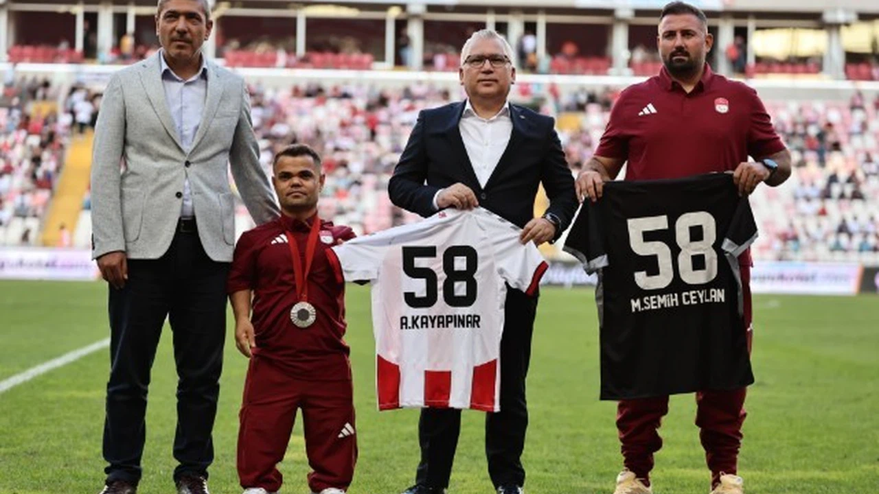 Sivas Valisi Yılmaz Şimşek, Paris 2024 Paralimpik Olimpiyat Oyunlarında erkekler 49 kiloda gümüş madalyanın sahibi olan Abdullah Kayapınar ve antrenörüne Net Global Sivasspor- Gaziantepapor karşılamasının devre arasında milli sporcumuzun isminin yazılı bulunduğu 58 numaralı Sivasspor forması hediye etti.