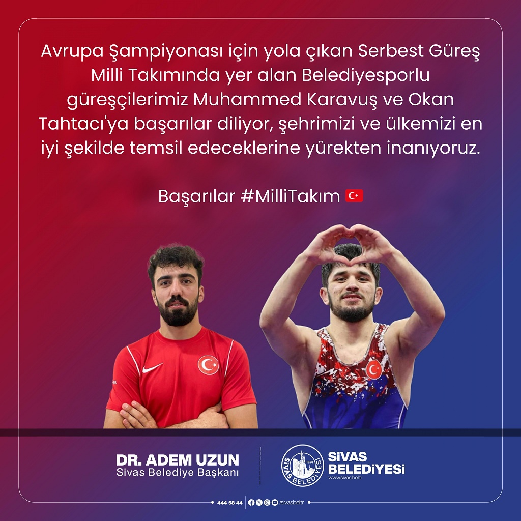 Sivas Belediyesi de yayımladığı mesajla milli güreşçilere destek verdi. Yapılan açıklamada, “7-13 Nisan tarihleri arasında düzenlenecek Avrupa Şampiyonası için yola çıkan Serbest Güreş Milli Takımı’nda yer alan Belediyesporlu güreşçilerimiz Muhammed Karavuş ve Okan Tahtacı'ya başarılar diliyor, şehrimizi ve ülkemizi en iyi şekilde temsil edeceklerine yürekten inanıyoruz.” ifadelerine yer verildi.