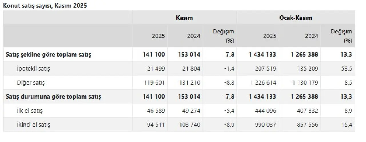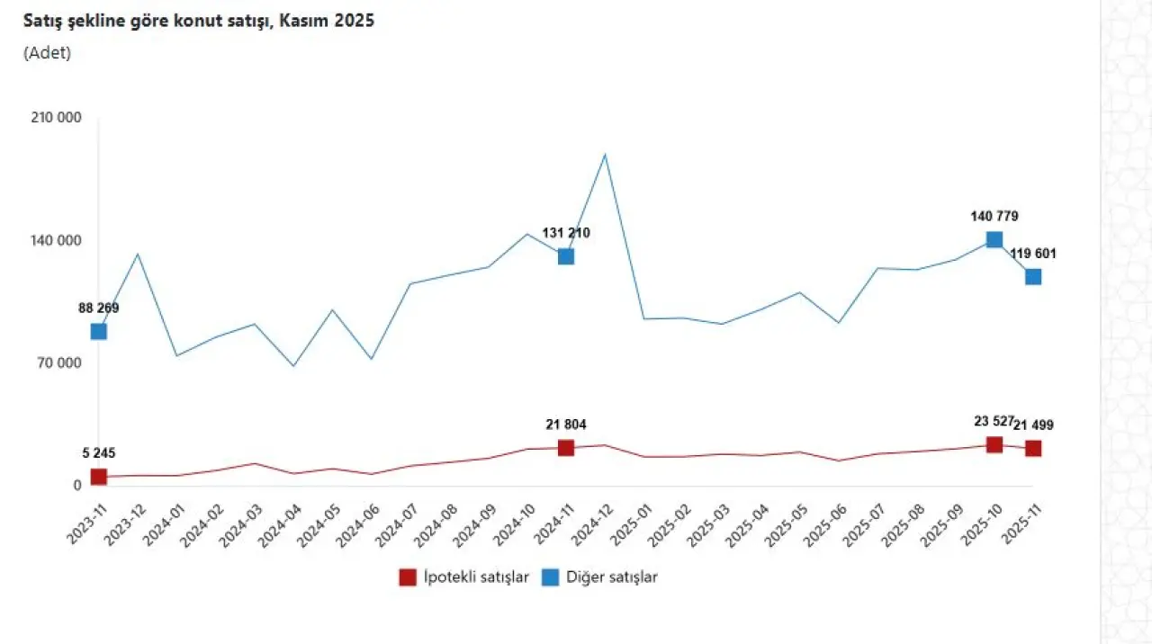 Peşin veya senet gibi yöntemleri kapsayan "diğer satış türleri" de Kasım ayındaki düşüşten nasibini aldı. Bu kategorideki satışlar yüzde 8,8 azalarak 119 bin 601 oldu. TÜİK konut satışı raporunun geneline bakıldığında, Kasım ayının durgun geçtiği ancak 2025 yılının toplamda pozitif bir ivmeyle kapatılacağı öngörülüyor. Emlak piyasasındaki bu dalgalanmaların Aralık ayında nasıl şekilleneceği ise şimdiden merak konusu.