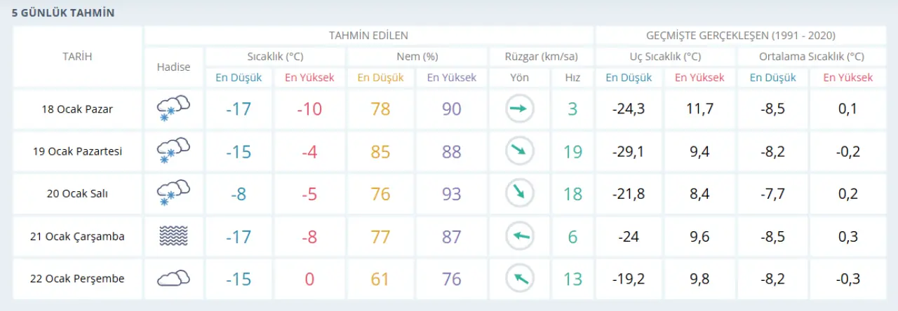 Paylaşılan verilere göre Sivas’ta beklenen sıcaklıklar, 1991–2020 yılları ortalamalarının da altına düşüyor. Bu durum, önümüzdeki günlerde rekor soğuklara yaklaşılabileceğini gösteriyor.