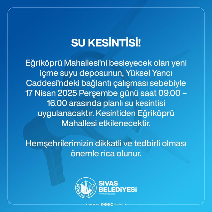 Sivas Belediyesi’nin yaptığı diğer bir duyuruya göre, Eğriköprü Mahallesi’ni besleyecek yeni içme suyu deposunun Yüksel Yancı Caddesi üzerindeki bağlantı çalışmaları nedeniyle, 17 Nisan 2025 Perşembe günü saat 09.00 - 16.00 arasında bölgede su kesintisi yaşanacak. Bu kesintiden sadece Eğriköprü Mahallesi etkilenecek. Belediyeden yapılan açıklamada, hemşehrilerin dikkatli ve tedbirli olması özellikle rica edildi.