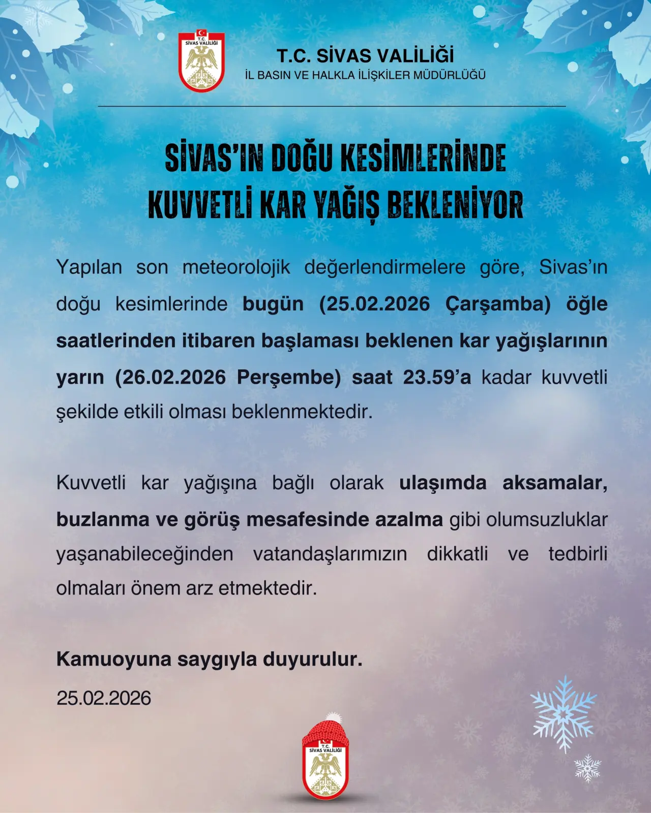 Sivas genelinde bahar havası beklenirken, Valilikten gelen son dakika açıklaması kışın henüz şehri terk etmediğini gösterdi. Yapılan son meteorolojik değerlendirmelere göre, Sivas’ın özellikle doğu kesimlerinde bugün (25.02.2026 Çarşamba) öğle saatlerinden itibaren hava şartlarında sert bir değişim yaşanacak. Şehrin yüksek kesimleri ve doğu ilçelerini etkisi altına alması beklenen kar yağışının, günlük yaşamı olumsuz etkileyebileceği tahmin ediliyor.