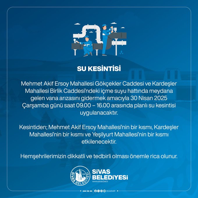 Sivas Belediyesi’nden yapılan açıklamaya göre, kentte yaşayan vatandaşları etkileyecek önemli bir su kesintisi yaşanacak. Mehmet Akif Ersoy Mahallesi Gökçekler Caddesi ve Kardeşler Mahallesi Birlik Caddesi’nde bulunan içme suyu hattında meydana gelen vana arızası, geniş kapsamlı bir çalışma gerektirdiği için 30 Nisan 2025 Çarşamba günü sabah saatlerinden itibaren planlı su kesintisi uygulanacak.