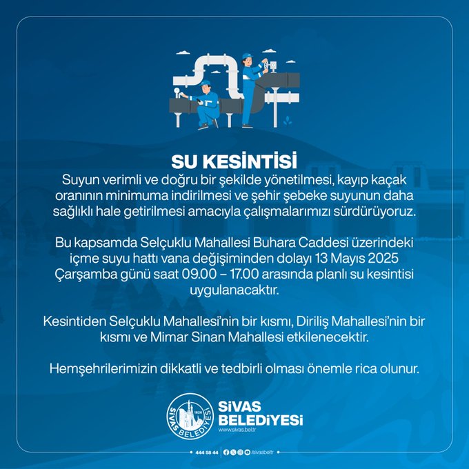 Sivas'ta yaşayan vatandaşlar için önemli bir uyarı geldi. Sivas Belediyesi tarafından yapılan açıklamaya göre, şehir genelinde su şebekesinin daha verimli ve sağlıklı hale getirilmesi amacıyla bazı mahallelerde planlı su kesintisi uygulanacak. Özellikle Selçuklu, Diriliş ve Mimar Sinan mahallelerinde ikamet eden vatandaşların, bu kesintiden etkilenmemeleri adına gerekli önlemleri önceden almaları gerekiyor.