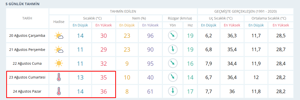 Meteoroloji tahminlerine göre 23 Ağustos Cumartesi günü en düşük sıcaklık 13 derece, en yüksek sıcaklık ise 35 derece olacak. 24 Ağustos Pazar günü ise en düşük 14 derece, en yüksek sıcaklık 36 dereceye çıkacak. Nem oranının düşük olması ve rüzgârın da zaman zaman etkisini azaltmasıyla birlikte sıcak hava daha bunaltıcı hissedilecek.