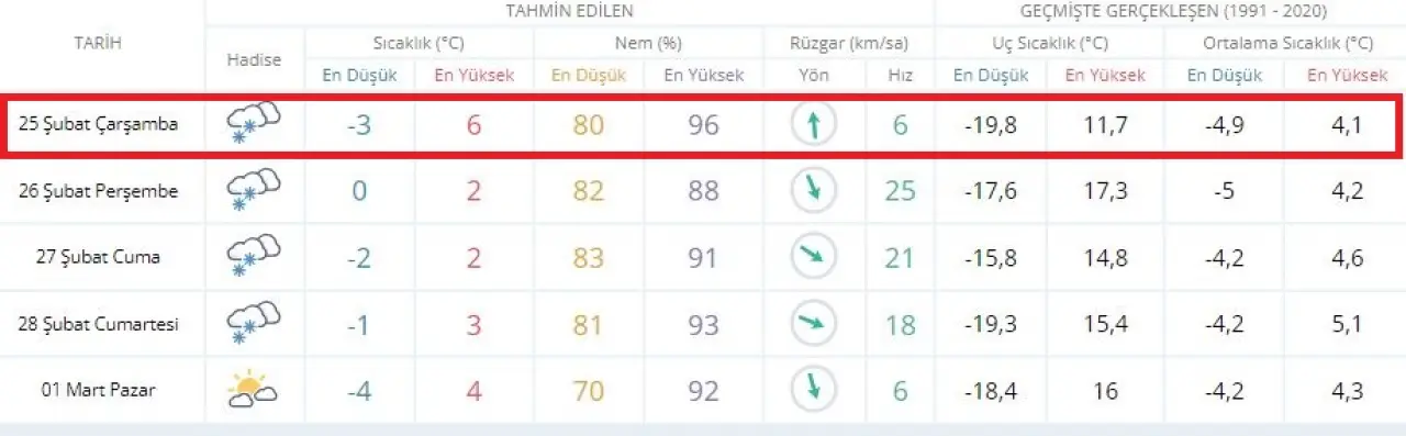 25 Şubat tarihi Sivas için geçmişte de oldukça çetin geçtiği biliniyor. 1991 ile 2020 yılları arasındaki kayıtlara bakıldığında, bu tarihte Sivas'ta sıcaklığın -19,8 gibi ekstrem seviyelere kadar düştüğü görülüyor. Yarın beklenen 6 derecelik en yüksek sıcaklık, geçmiş ortalamaların (4,1 derece) biraz üzerinde kalsa da beklenen karla karışık yağış ve dondurucu nem dengeleri bozacak gibi duruyor. Sivaslıların hem geçmiş tecrübeleri hem de güncel tahminleri dikkate alarak planlarını yapması, günün olumsuzluklarından etkilenmemek adına kritik bir adım olacak.
