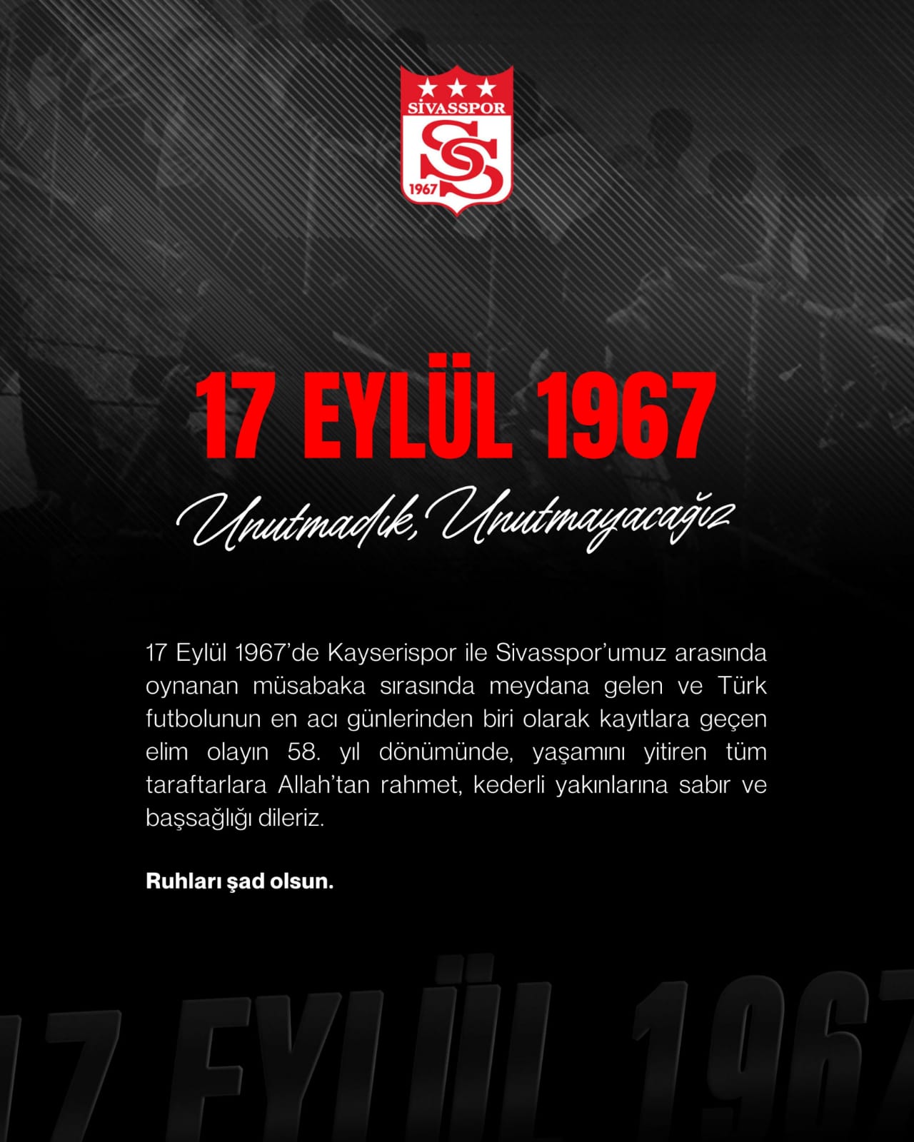 "17 Eylül 1967’de Kayserispor ile Sivasspor’umuz arasında oynanan müsabaka sırasında meydana gelen ve Türk futbolunun en acı günlerinden biri olarak kayıtlara geçen elim olayın 58. yıl dönümünde, yaşamını yitiren tüm taraftarlara Allah’tan rahmet, kederli yakınlarına sabır ve başsağlığı dileriz.