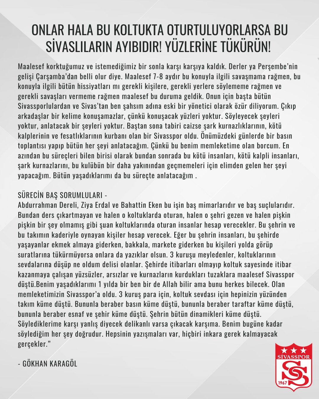 Gökhan Karagöl, açıklamalarında finansal konulara ve kişisel çıkarlara da değindi. "3 kuruşu meyledenler, koltuklarının sevdalarına düşüp ne oldum delisi olanlar. Şehirde itibarları olmayıp koltuk sayesinde itibar kazanmaya çalışan yüzsüzler, arsızlar ve kurnazların kurdukları tuzaklara maalesef Sivasspor düştü" ifadeleriyle yönetime ağır eleştiriler yöneltti.