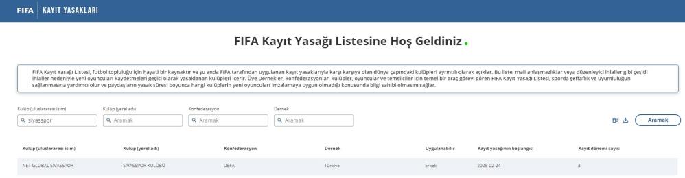 Süper Lig’de zor günler geçiren Sivasspor’a FIFA’dan kötü haber geldi. FIFA’nın internet sitesinden yayınlanan cezalara göre, kırmızı-beyazlılara 3 dönem transfer yasağı verildi.