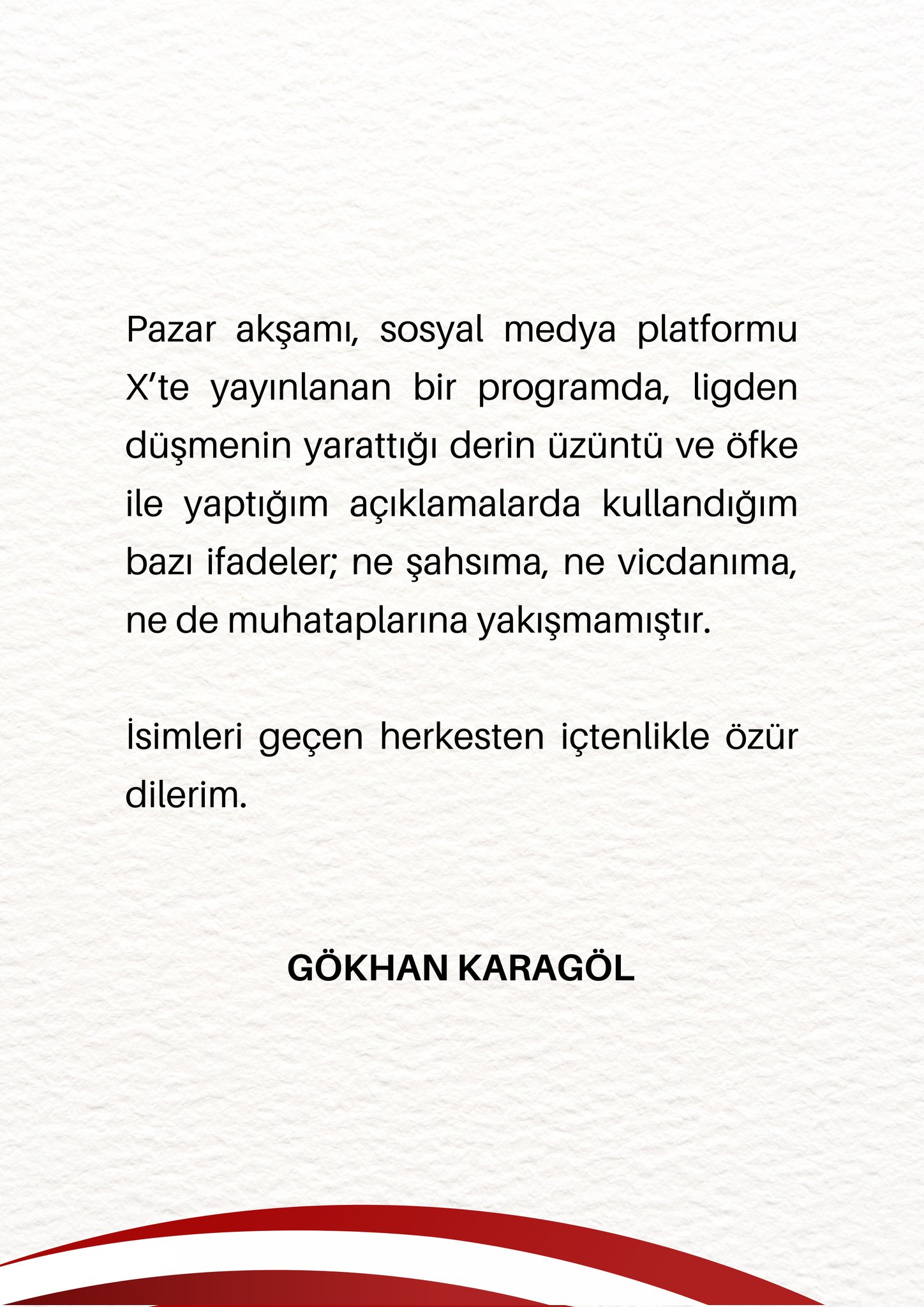 Bu açıklamaların ardından Gökhan Karagöl, bugün sosyal medya hesabından yaptığı yeni bir paylaşımla, daha önceki ifadeleri nedeniyle pişmanlığını dile getirdi. Karagöl, yayınladığı özür metninde şu ifadelere yer verdi: "Pazar akşamı, sosyal medya platformu X'te yayınlanan bir programda, ligden düşmenin yarattığı derin üzüntü ve öfke ile yaptığım açıklamalarda kullandığım bazı ifadeler; ne şahsıma, ne vicdanıma, ne de muhataplarına yakışmamıştır. İsimleri geçen herkesten içtenlikle özür dilerim. GÖKHAN KARAGÖL"