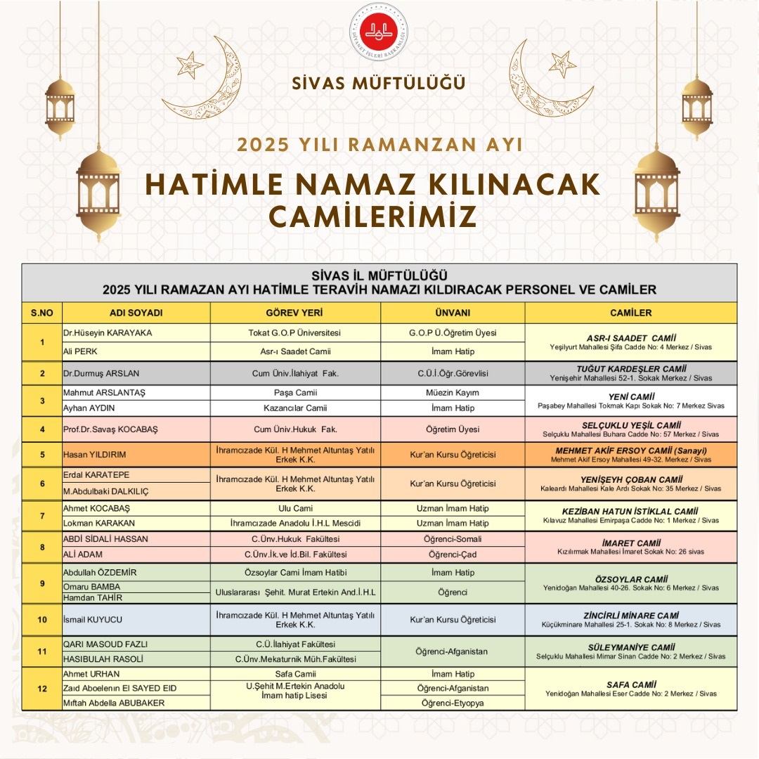 Ramazan’ın bereketiyle birlikte, bu yıl teravih namazları, Asr-ı Saadet Cami, Tuğut Kardeşler Cami, Yeni Cami, Selçuklu Yeşil Cami, Mehmet Akif Ersoy Cami, Yenşeyh Çoban Cami, Keziban Hatun İstiklal Cami, İmaret Cami, Özsoylar Cami, Zincirli Minare Cami, Süleymaniye Cami ve Safa Cami gibi Sivas’ın farklı noktalarındaki camilerde gerçekleştirilecek. Her bir cami, Ramazan boyunca hatimle namaz kılınacak ve bu manevi atmosfer, Sivaslılar için özel bir deneyim sunacak.