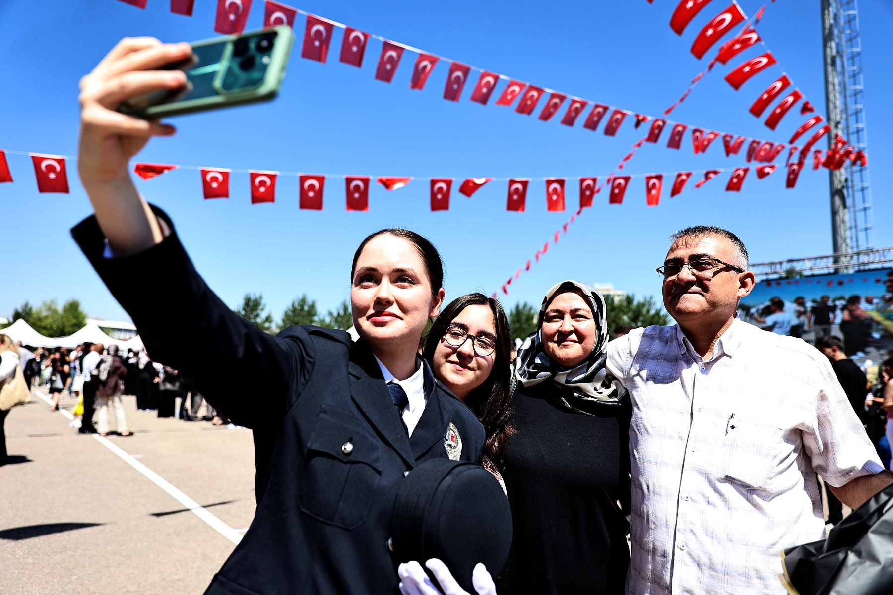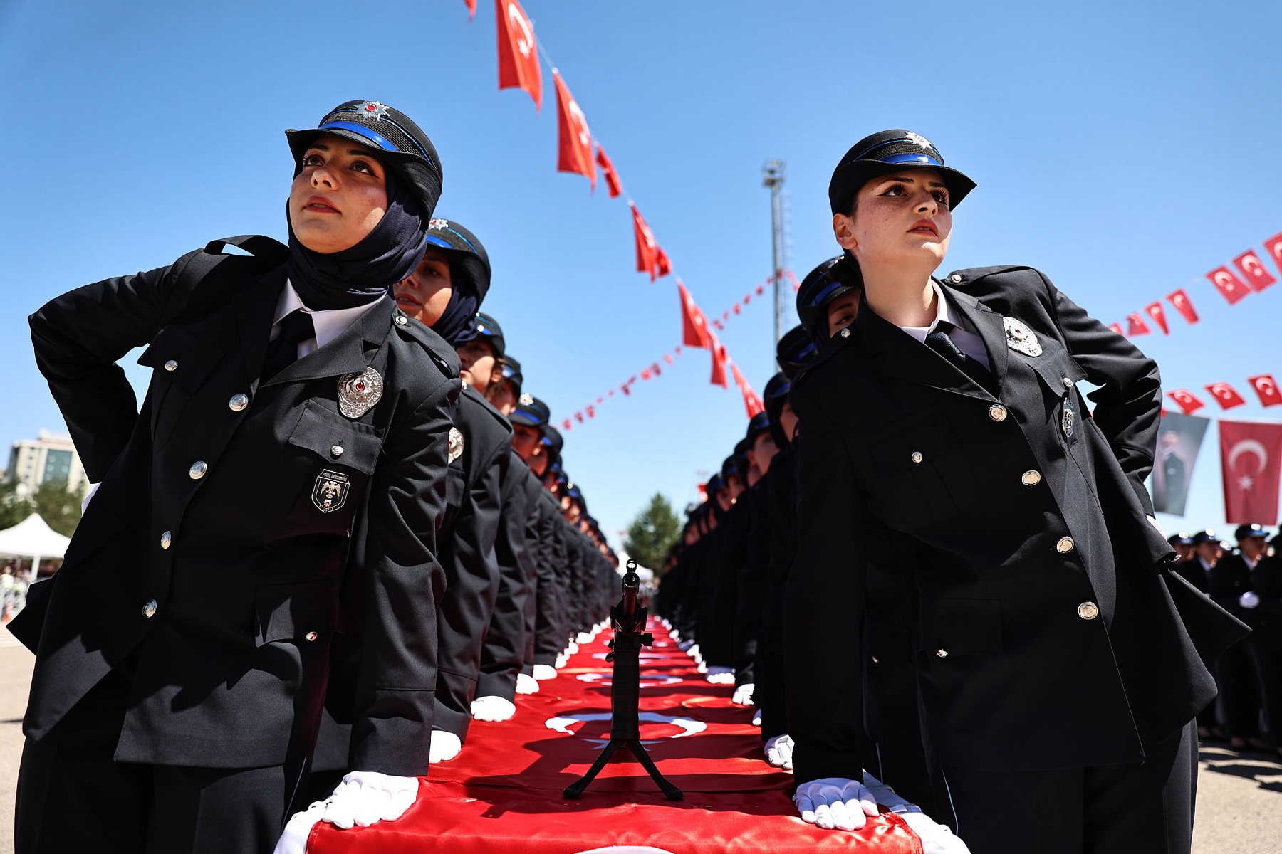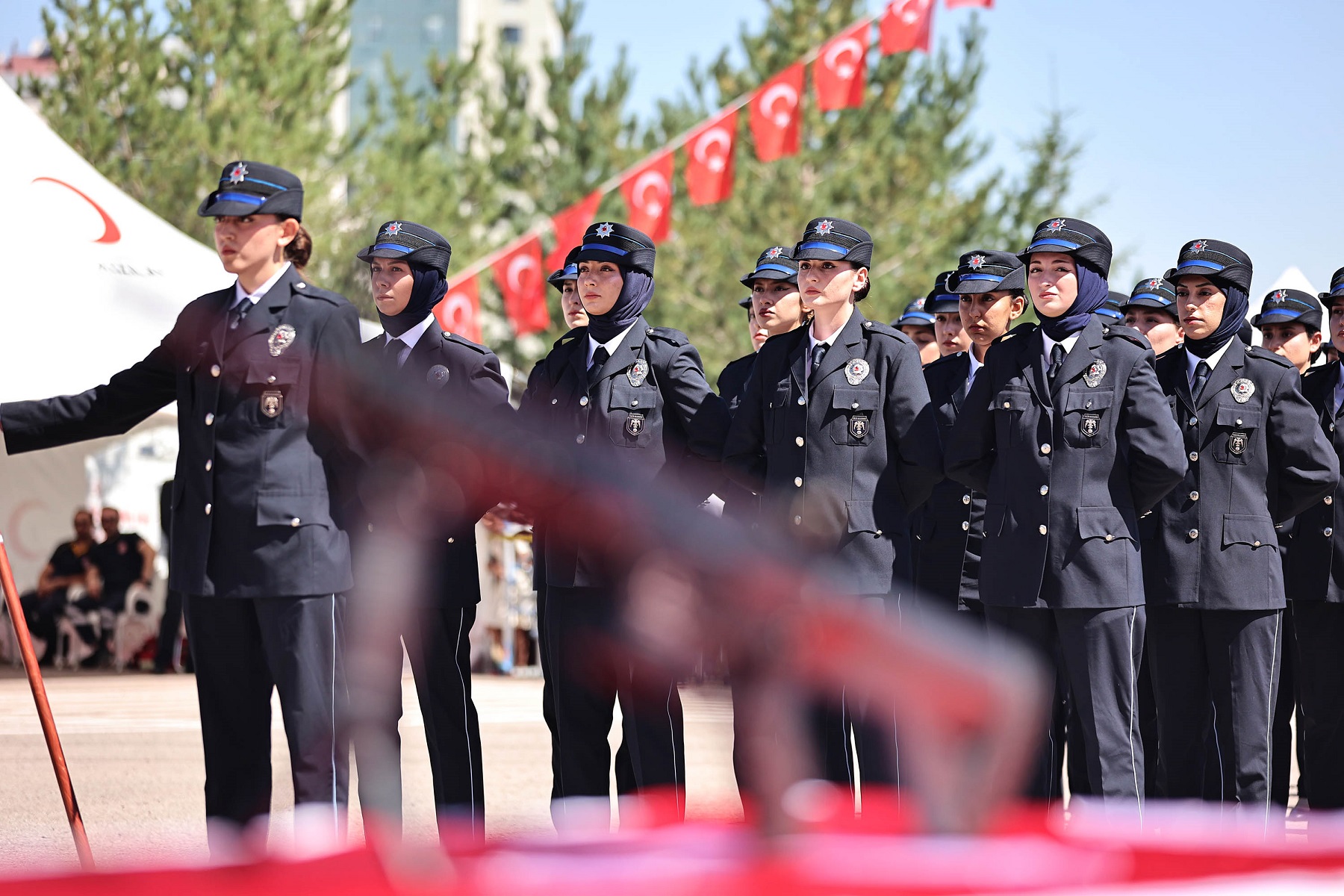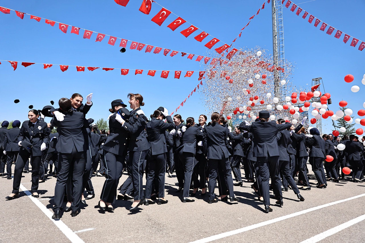 Tören, polis adaylarının yemin etmesi ve coşkuyla keplerini havaya fırlatmasıyla sona erdi.