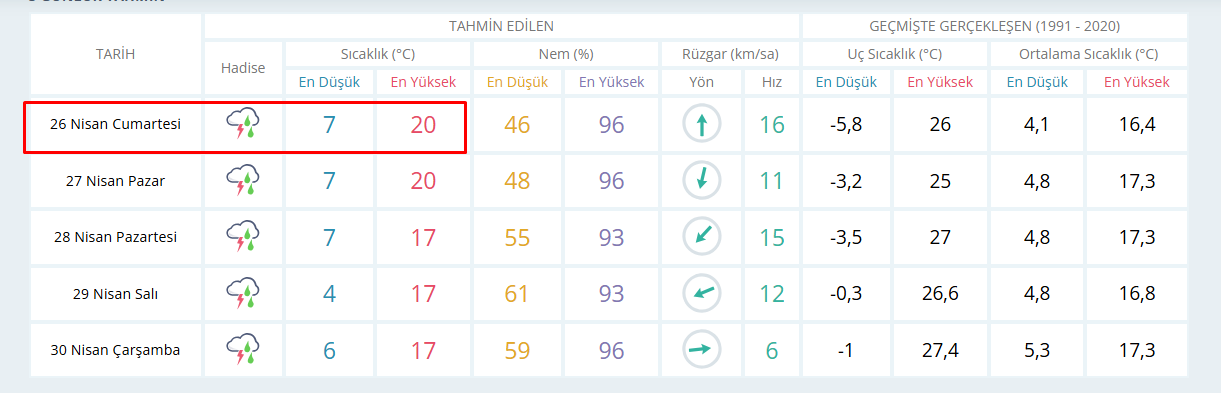 Meteoroloji Genel Müdürlüğü’nün yayımladığı günlük hava tahmin raporuna göre, 26 Nisan Cumartesi günü Sivas’ta gök gürültülü sağanak yağış bekleniyor. Vatandaşların hafta sonu planlarını yaparken hava durumuna dikkat etmeleri tavsiye ediliyor.