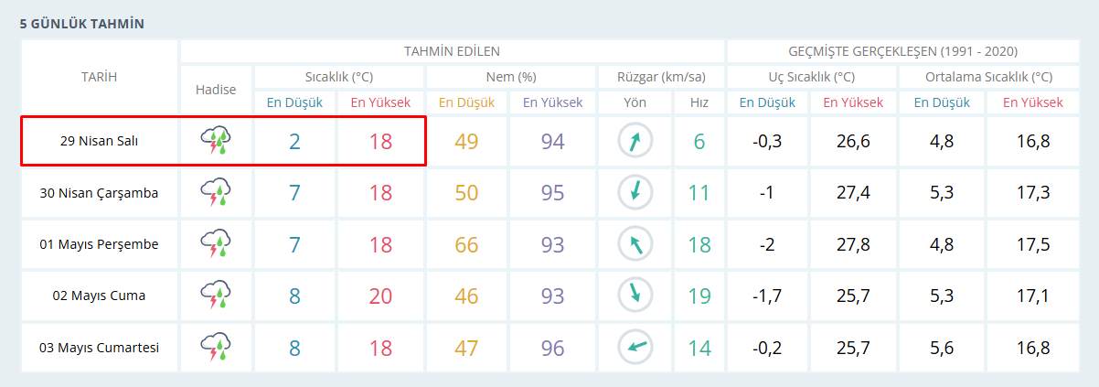 29 Nisan Salı günü rüzgar doğu yönünden saatte 6 kilometre hızla esecek. Rüzgarın şiddetinin düşük olması nedeniyle hava serin ancak durgun hissedilecek. Yağışlı hava ile birlikte özellikle araç sürücülerinin dikkatli olmaları öneriliyor.